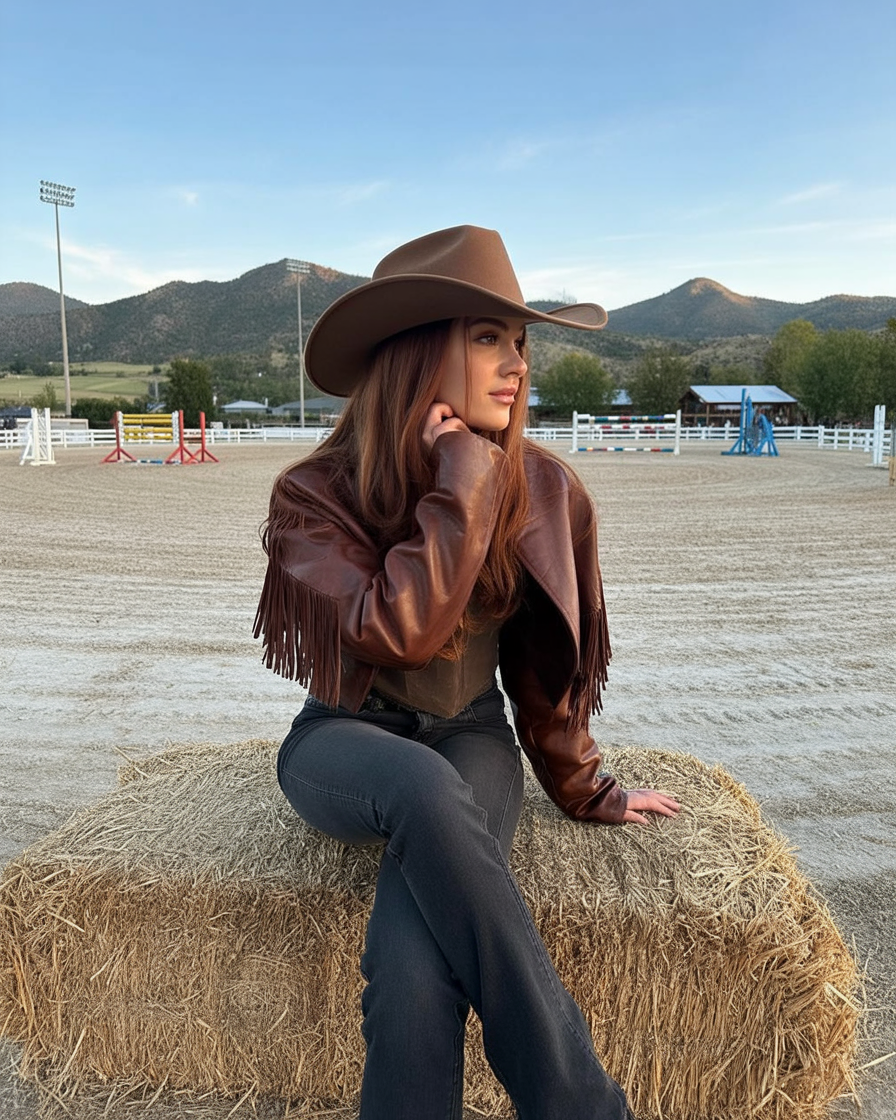 This look is pure country confidence. The fringe jacket adds movement and personality, giving off a strong cowgirl vibe that feels timeless. It’s bold but familiar, expressive without being flashy—a true western classic with modern polish.