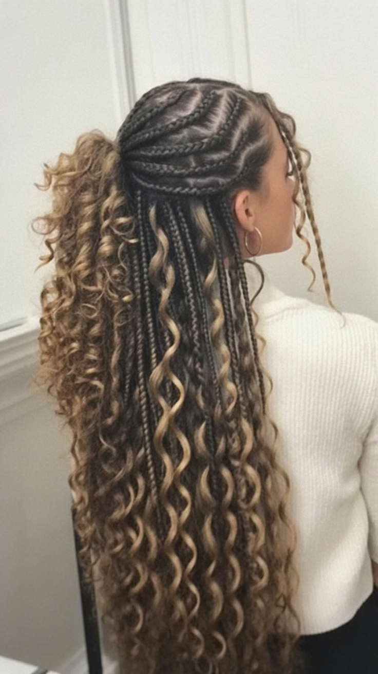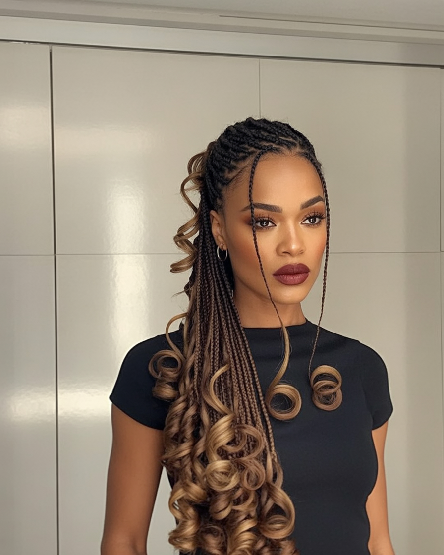 This appearance is winter goddess oxygen. A combination of tight cornrows and flowing into loose and highlighted curls makes the overall atmosphere dreamy and free-spirited, but soft and statement-making. At least I think it would be like sipping a latte at the window and strategizing your next bold move- it would be warm, textured and full of life.