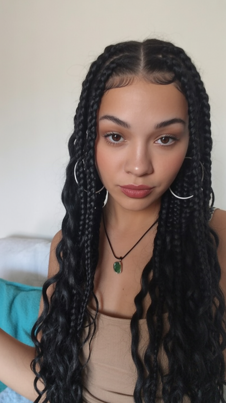 This braid-and-wave arrangement is playful in rhythm. It is borderline rough and gentle, the thick braids in combination with finer ones and falling waves are simply chef-kiss. It has grown-woman glam and a hint of youthful appeal, and it is ideal on a warm brunch or frosty date.