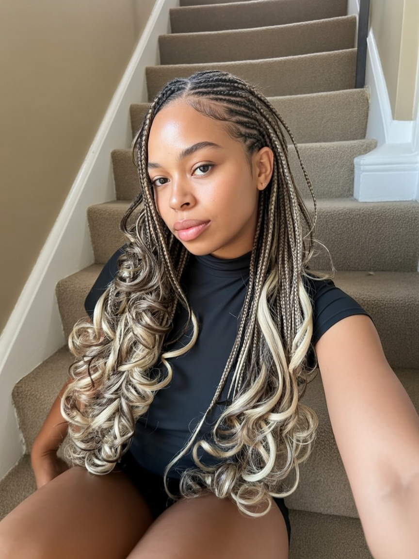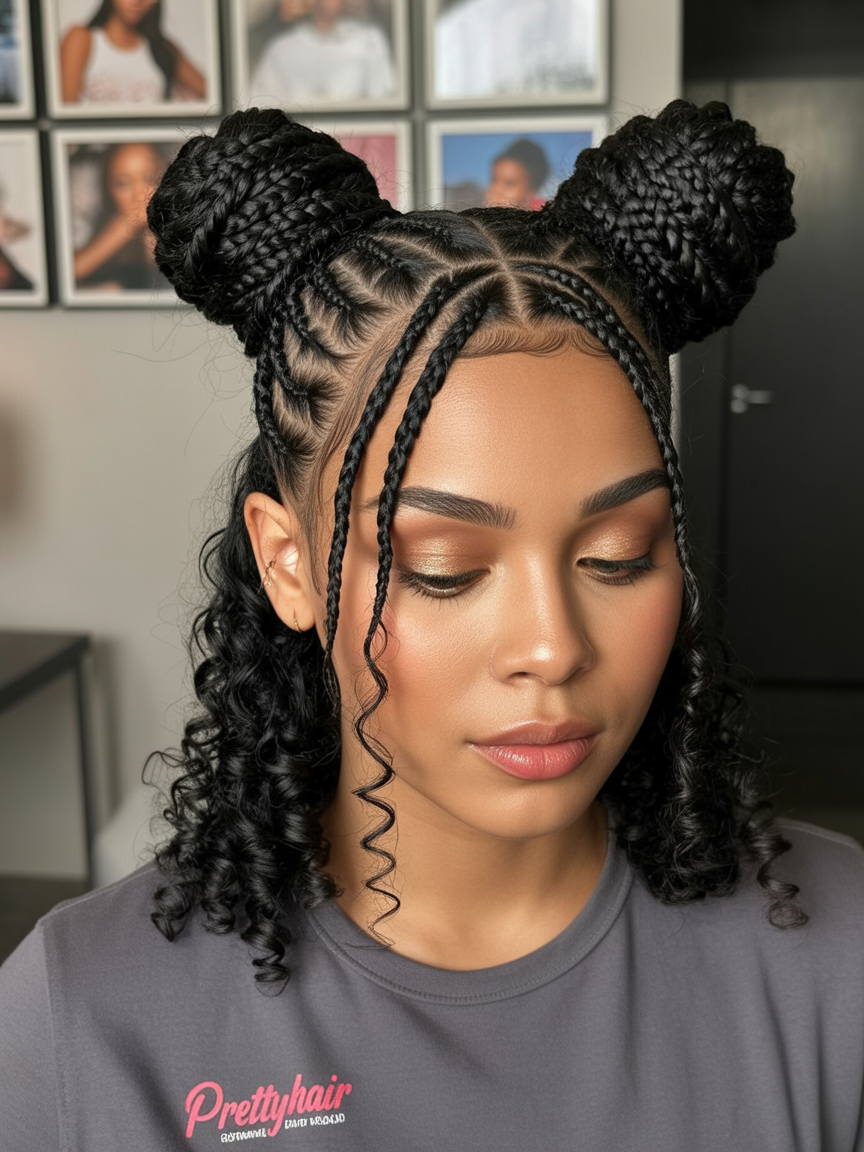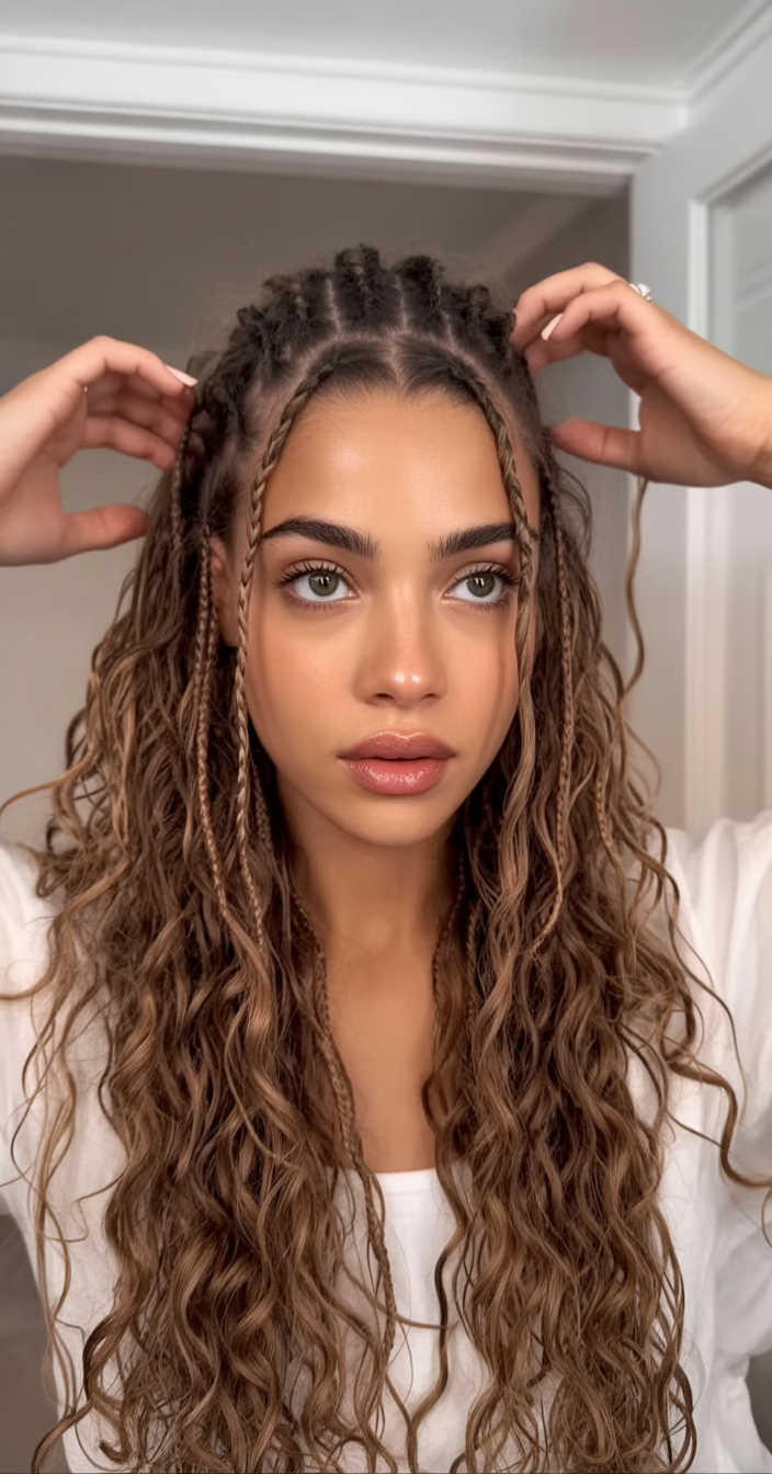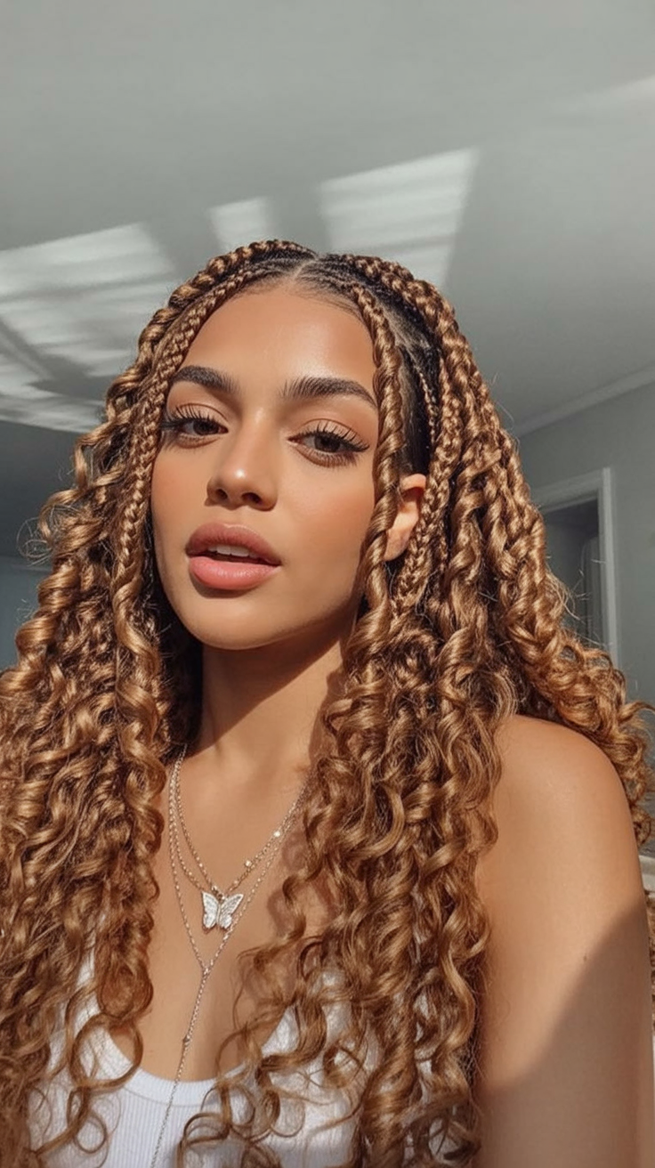 Something so dreamy about this style–it is like catching golden hour in your hair. The butterfly braids plus the honey-blonde curls are not sugary yet sweet. It is romantic, gentle and Insta-worthy.