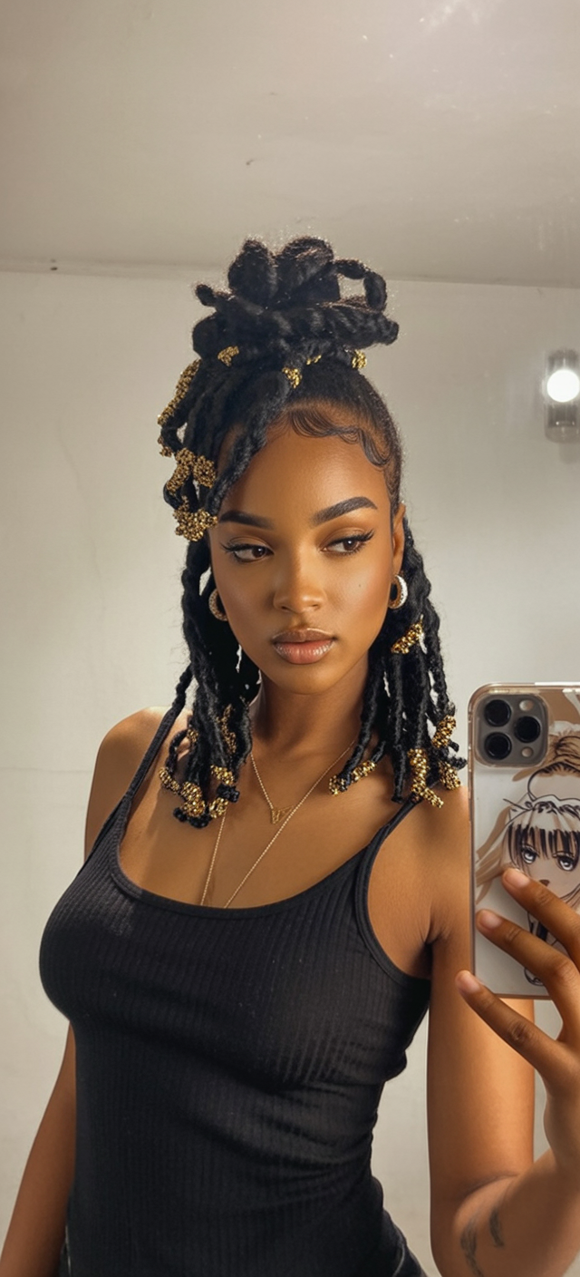 The queens who prefer the crowns to be a bit higher wear this style. The heavy half up Bantu knots bring some drama and creativity to it and the beaded locs bring the sense of texture and personality. It is half warrior, half whimsical -and 100 percent memorable.