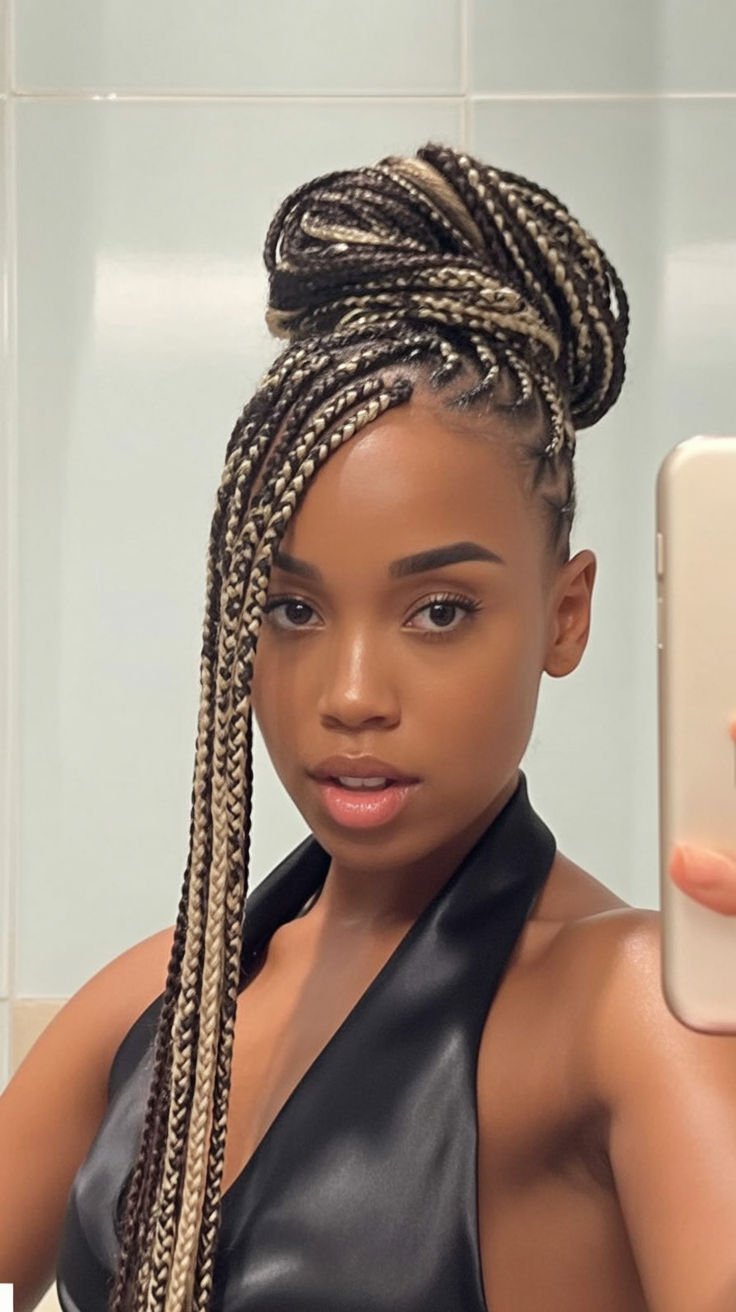 It performs miracles in any face shape and particularly in oval or square face. Due to the more light tips, this is a hair color highlight moment worth trying as a seasonal change. Remember to hydrate your braids with a light weight oil and keep the bun tight by using large pins to ensure that everything stays put throughout the day.
