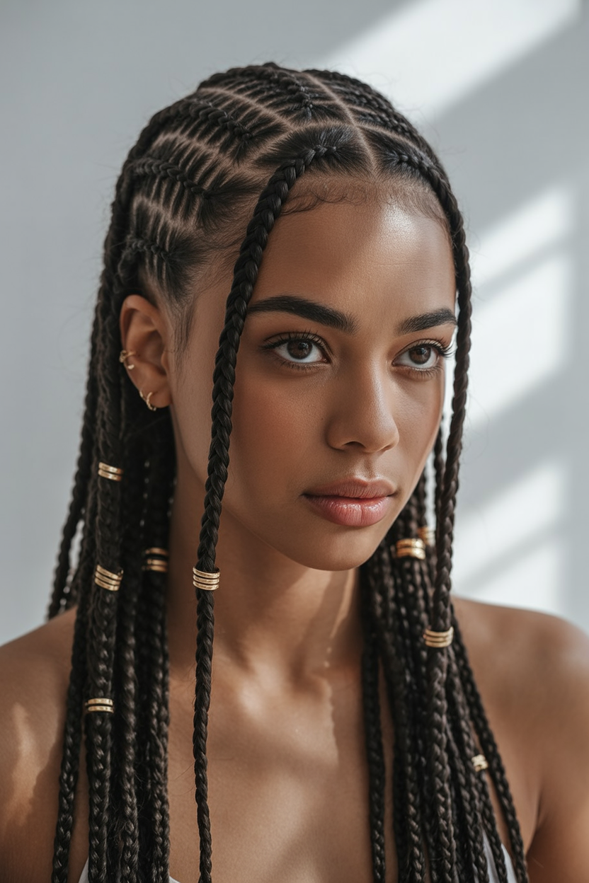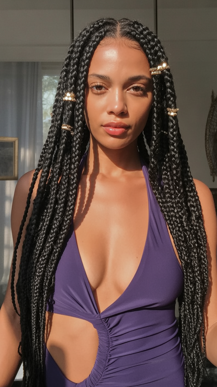 23. Waist-Length Knotless Braids with Gold Cuffs
