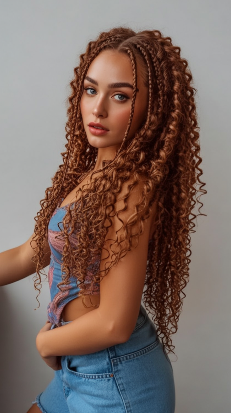 These plaitings are like a sunbeam during midwinter. Those deep copper locks, and the Soft curls give out a mermaid-meets-boho glam. It is an entire atmosphere, daring, down to earth, and free-spirited as ever.