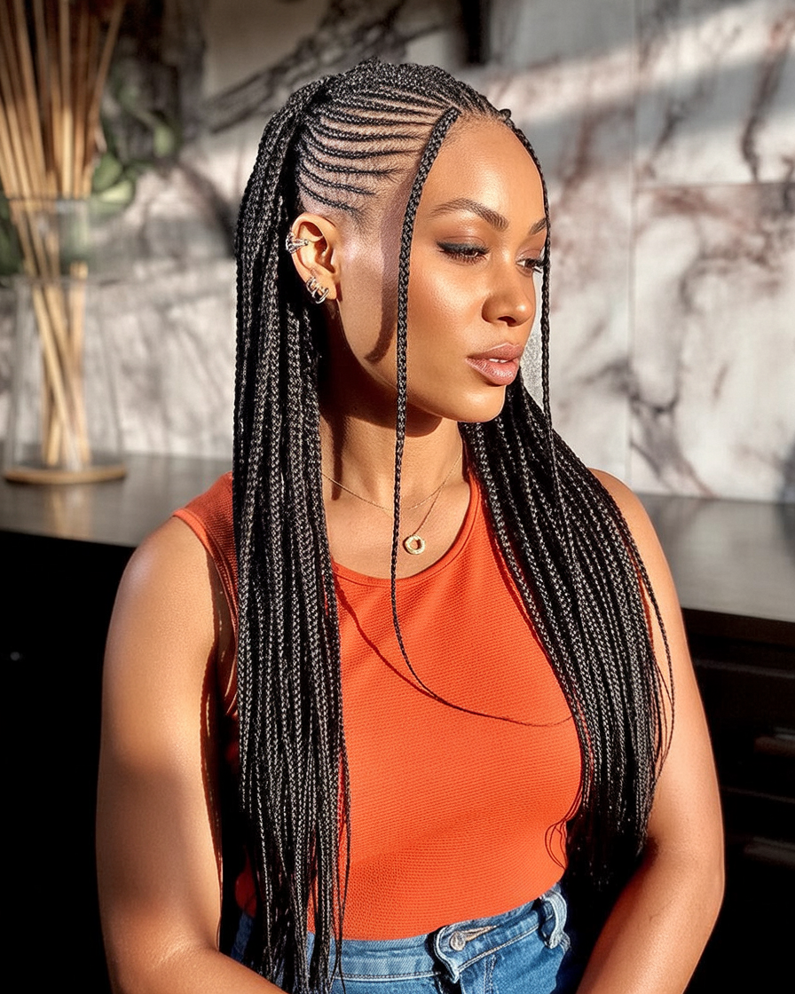 Something is very strong about the clean lines of these side-parted cornrows. It exudes great self-confidence – a woman who knows what she exactly wants and walks into any room as though she were the owner of it. The cascading locks cascade beautifully on one side combining edge with elegance with ease.