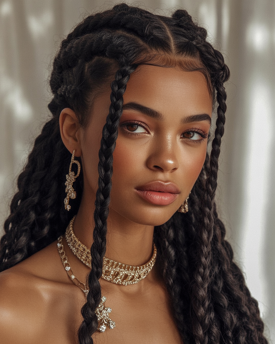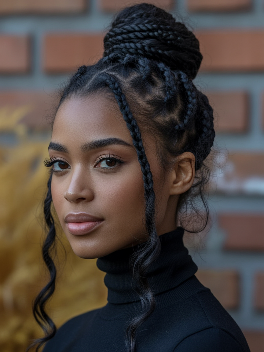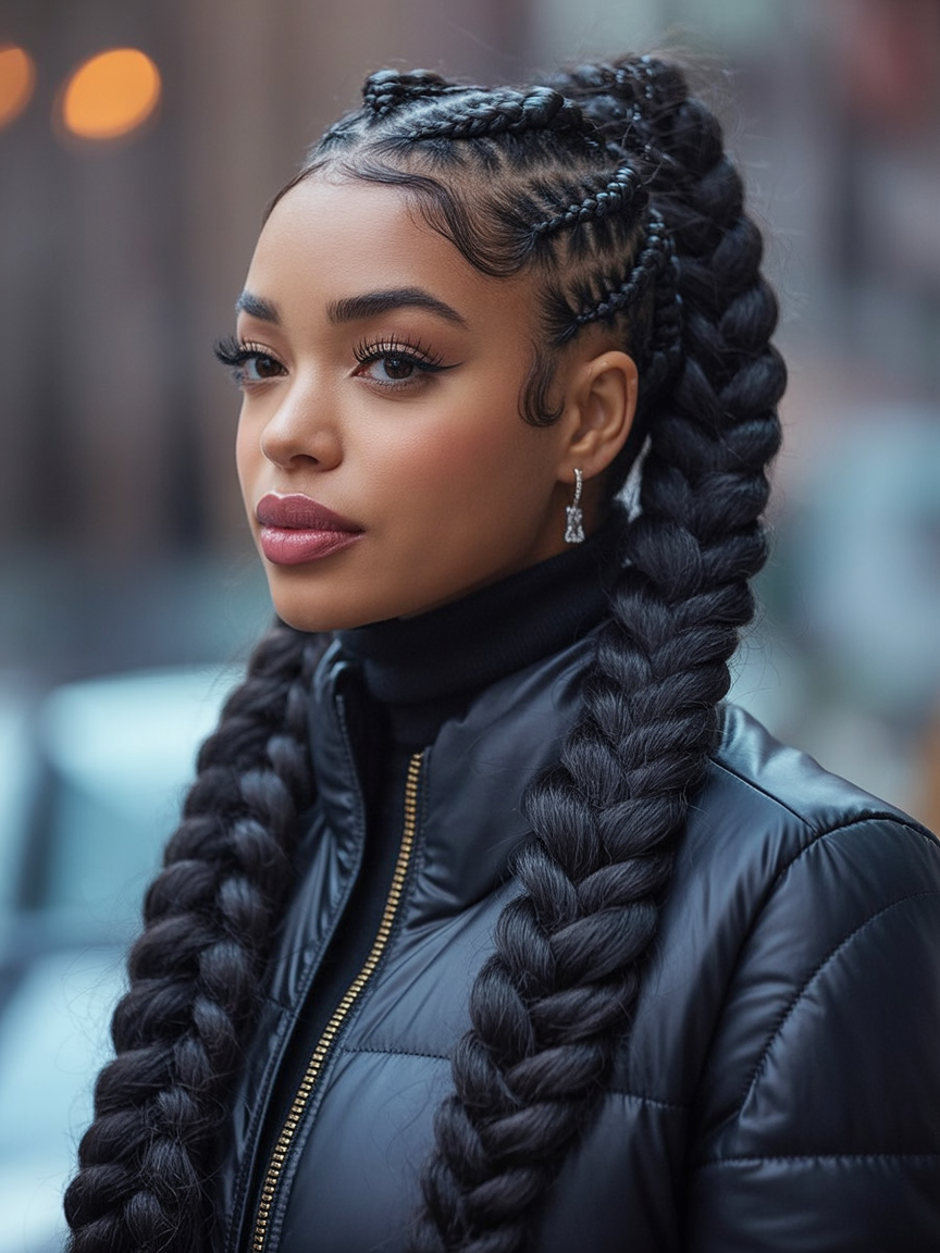 This is a kingly way and is all about elegance. The defined baby hairs and middle braid contour the face soft, the thick and symmetrical braids bring drama and strength. Coupled with bold jewelry and glowing skin, it is making the main character in a winter romance movie- stunning and unforgettable.