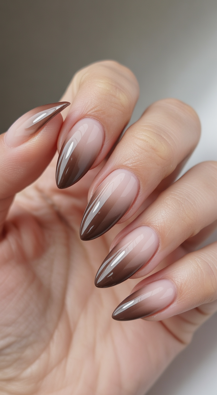 Dark, daring and slightly mysterious, these deep autumn ombr. nails make a statement in all the right ways. The soft nude color to the dark espresso brown is just like your favorite latte, only greater. That shiny almond color makes them virtually invite you to a power pose, strong coffee in the hands.