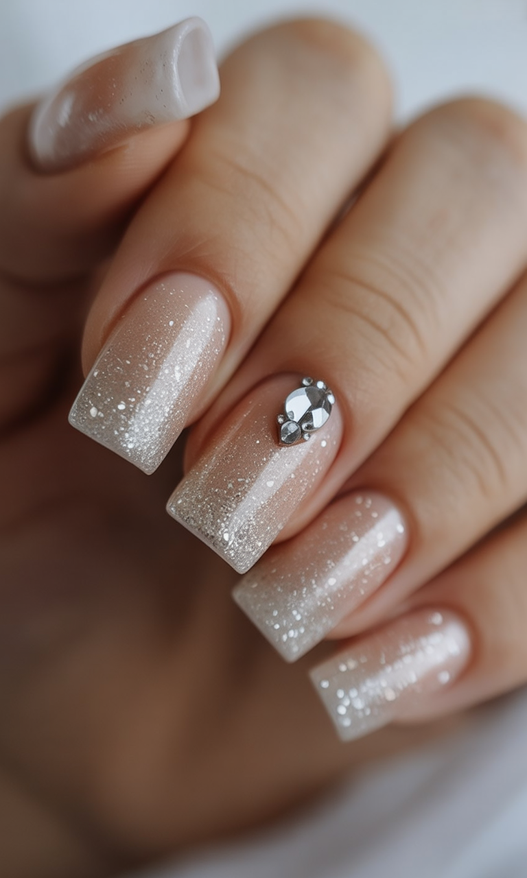 This is definitely a luxury look, but never over the top with it, there is something rather quietly luxurious about this look like putting on a silky evening dress that perfectly shimmers. The foundation of nudity is raised with delicate glittery snow and the huge focus is given to the single nail that is accented by a crystal. It feels refined yet casual enough to not be stuffy, so it is the perfect outerwear to wear when you need to look official without feeling like it.