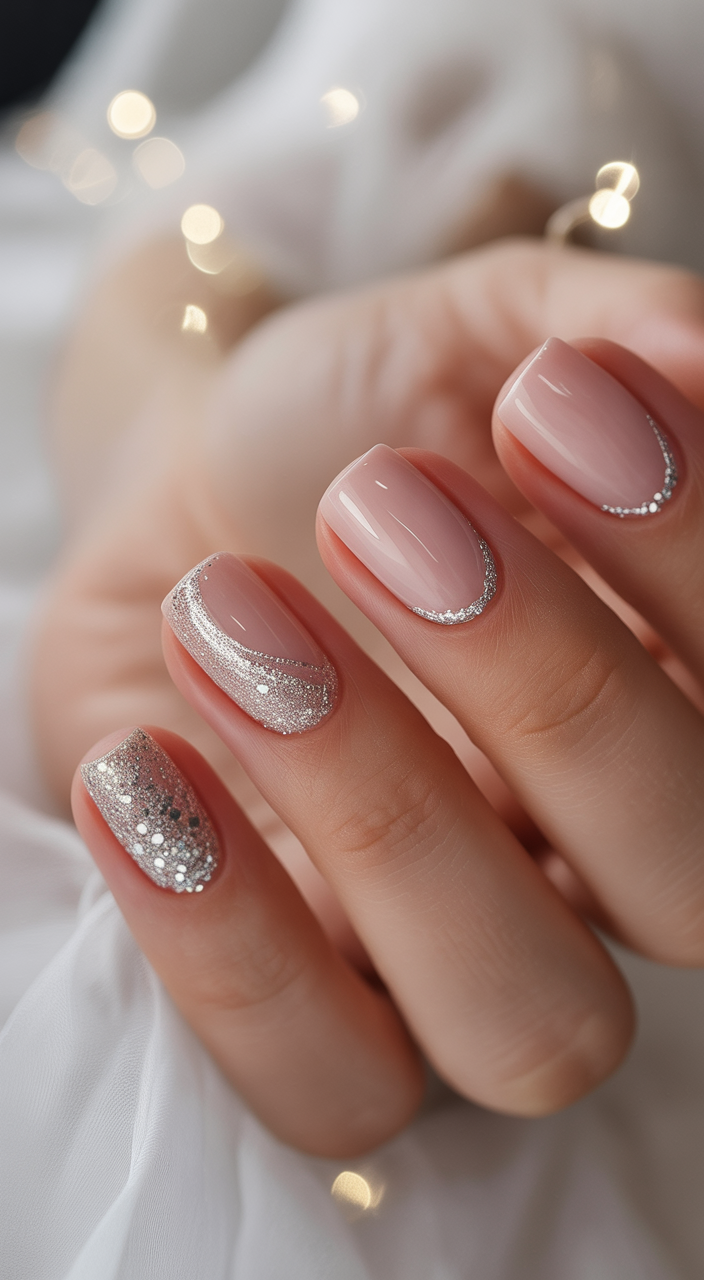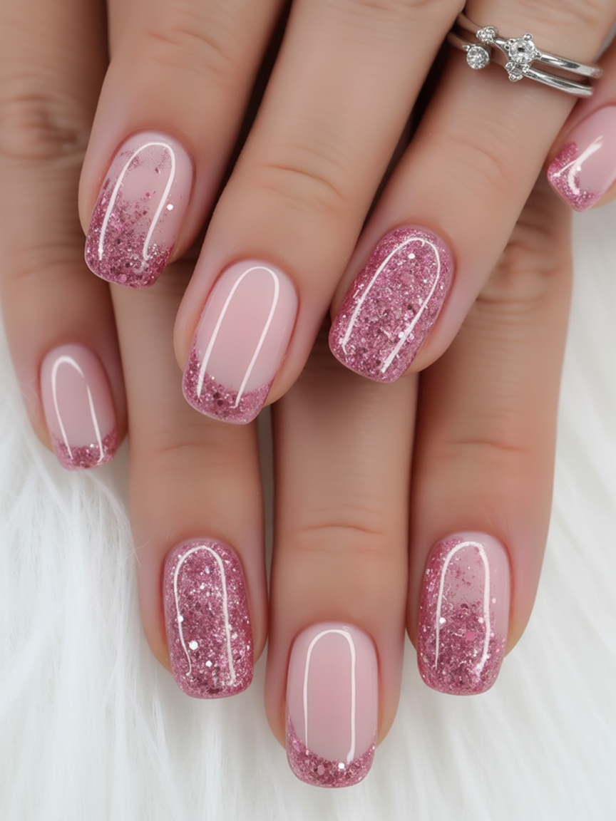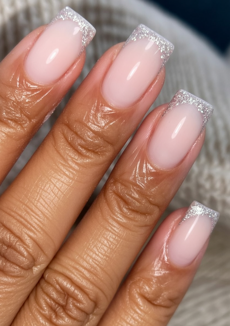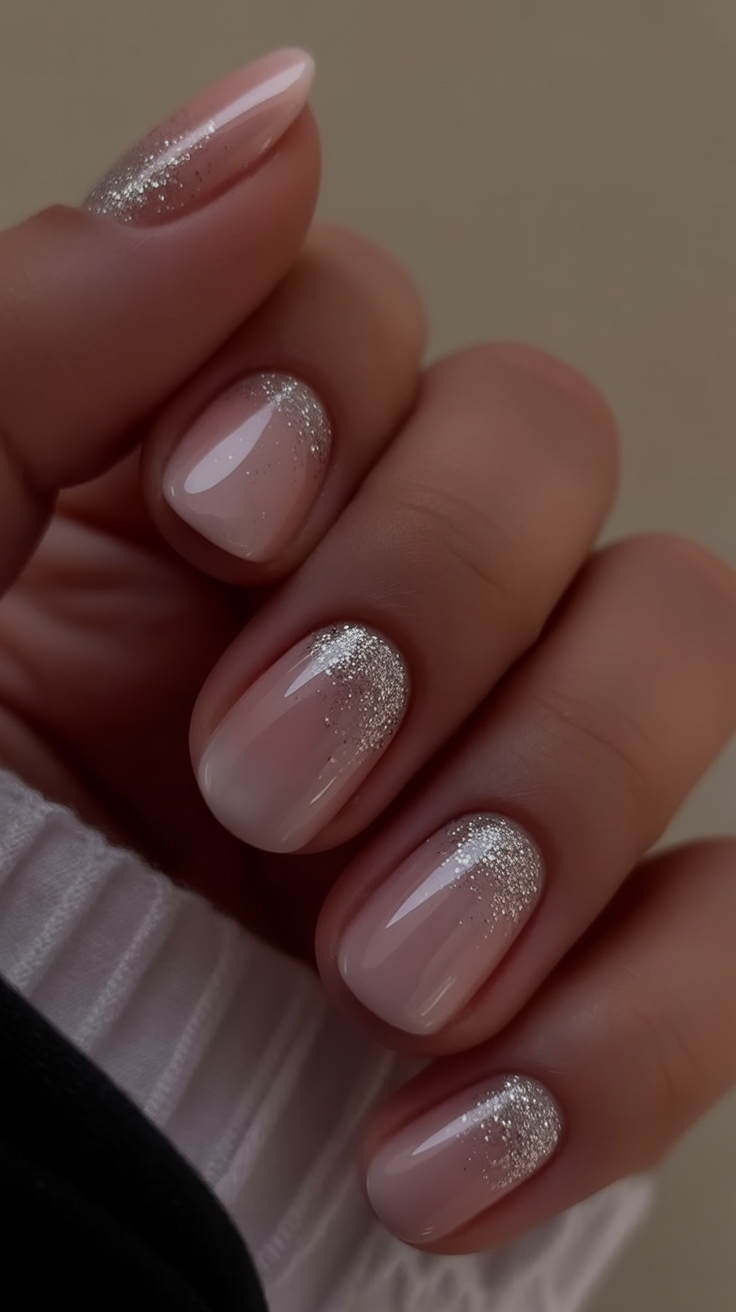 This design reminds the first snow of the season – suitable, calming, a bit of nostalgia. Made of a soft pink base, the delicate glitter fade also adds a hint of sparkle, so your nails look effortlessly elegant. It’s cozy, feminine, and full of quiet charm.
