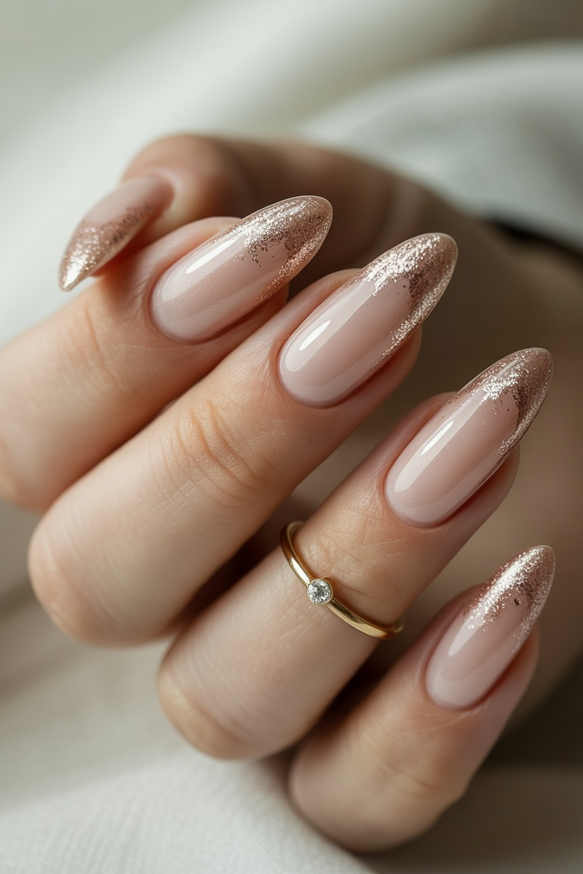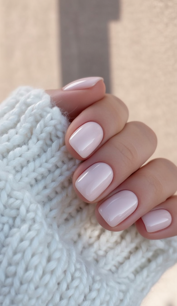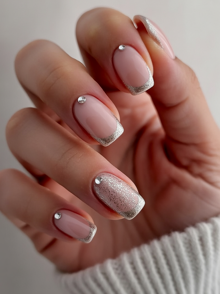 This design reminds the first snow of the season – suitable, calming, a bit of nostalgia. Made of a soft pink base, the delicate glitter fade also adds a hint of sparkle, so your nails look effortlessly elegant. It’s cozy, feminine, and full of quiet charm.