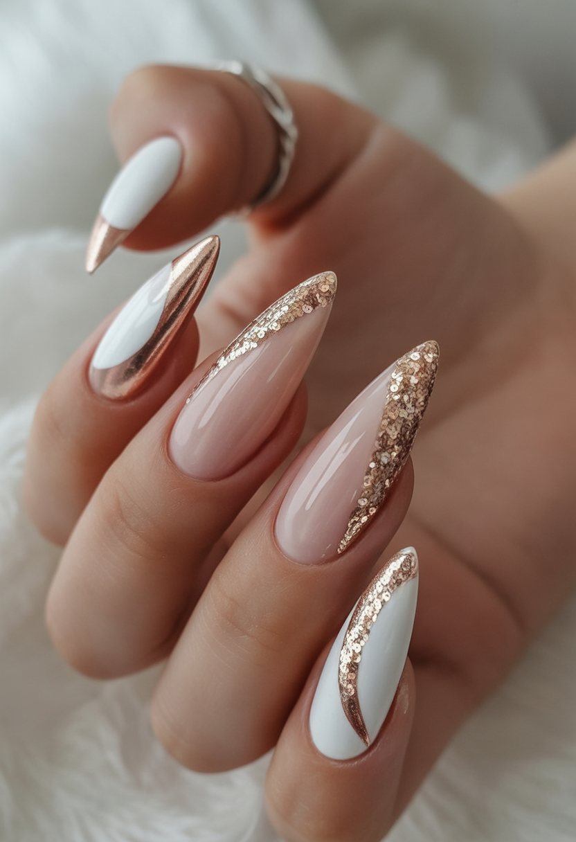 Drama meets elegance in this rose-gold-dipped masterpiece. The sharp coffin nails are designed with a sleek contrast of white and shimmering rose-gold curves that create a design that is as fashion forward as it is futuristic. Itâs the nail equivalent of slipping into a glittering cocktail dress -confidence on tap.