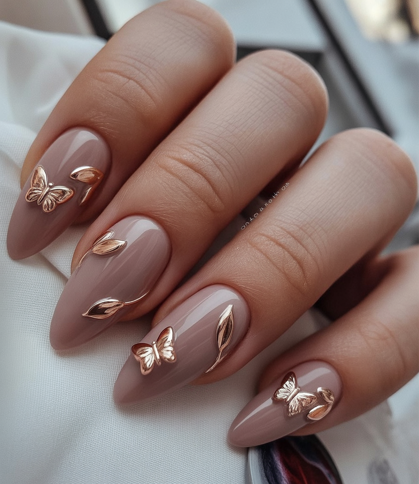 Romantic but still soft and textured – these dusty rose nails with their slight golden butterflies and leaves are like a fairy tale in the garden. There is a certain ethereal essence to this composition, like poetry in motion, and it is ideal when you want to feel encapsulated in grace.