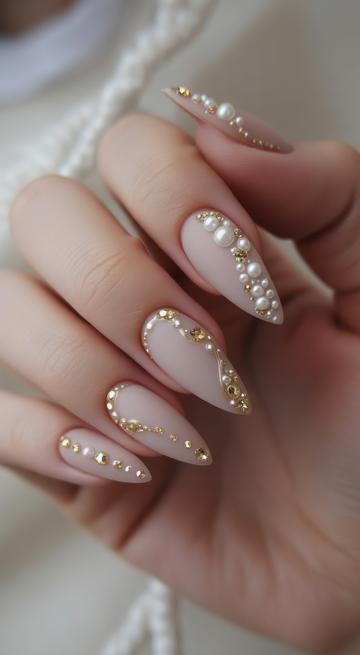 The combination is the definition of nail couture a runway moment right at your fingertips. The creamy nude matte is transformed into a platform where pearls and gold faceted jewels move in every contour. It’s opulent without being flashy, bold but not brash. It is your own jewelry box, but better.