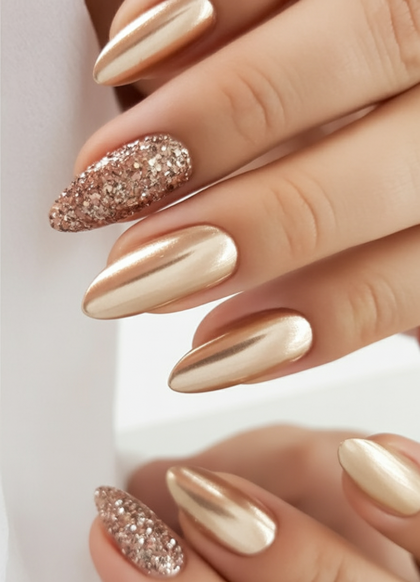 The gold-tipped almond nails precisely comes to trend strong in 2025 because of its ability to be edgy yet backflip easy to execute. It can be worn in the office but is glamorous enough that one can wear it out in the evening. To retain the color, apply a clear top coat E3 every 3-4 days, and do not exposure to heavy duty water.