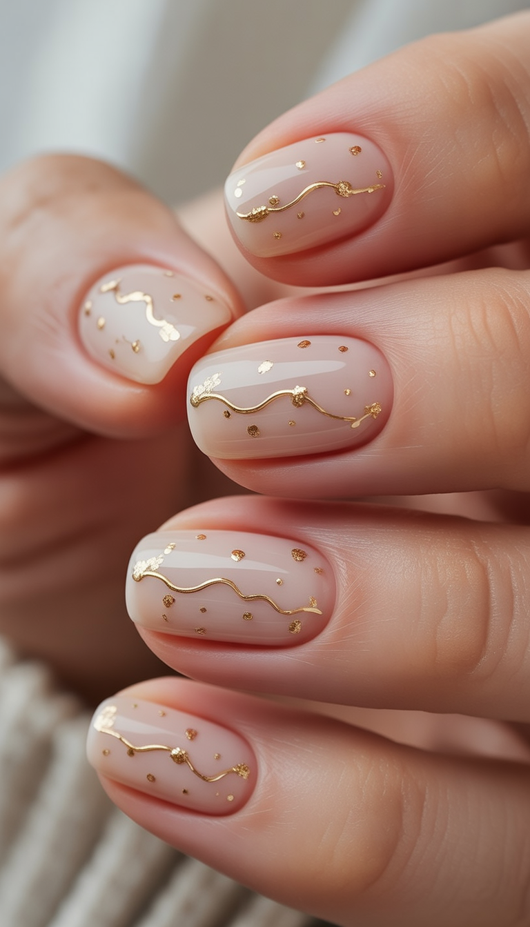 Cute, fun, and definitely wearable, these whimsical gold squiggles and dots are like your go-to dainty earrings redesigned as a nail art. Ample beige lining allows the gold to glow without overtaking the eye, keeping it light, youthful, and its glamour to stay put.