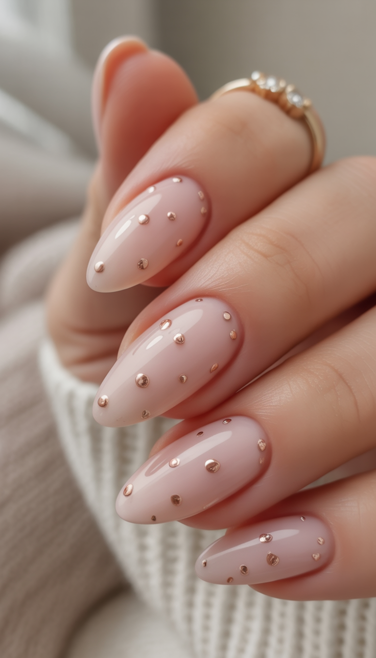 This manicure is strikingly understated; your go-to nude heel but with some flair to it. The almond shape could not be more chic and feminine and the row of scatters of golden dots will give a modern touch without overdoing the lingering element of sparkly. It’s the kind of look that works whether you’re holding a champagne flute or just your morning coffee.