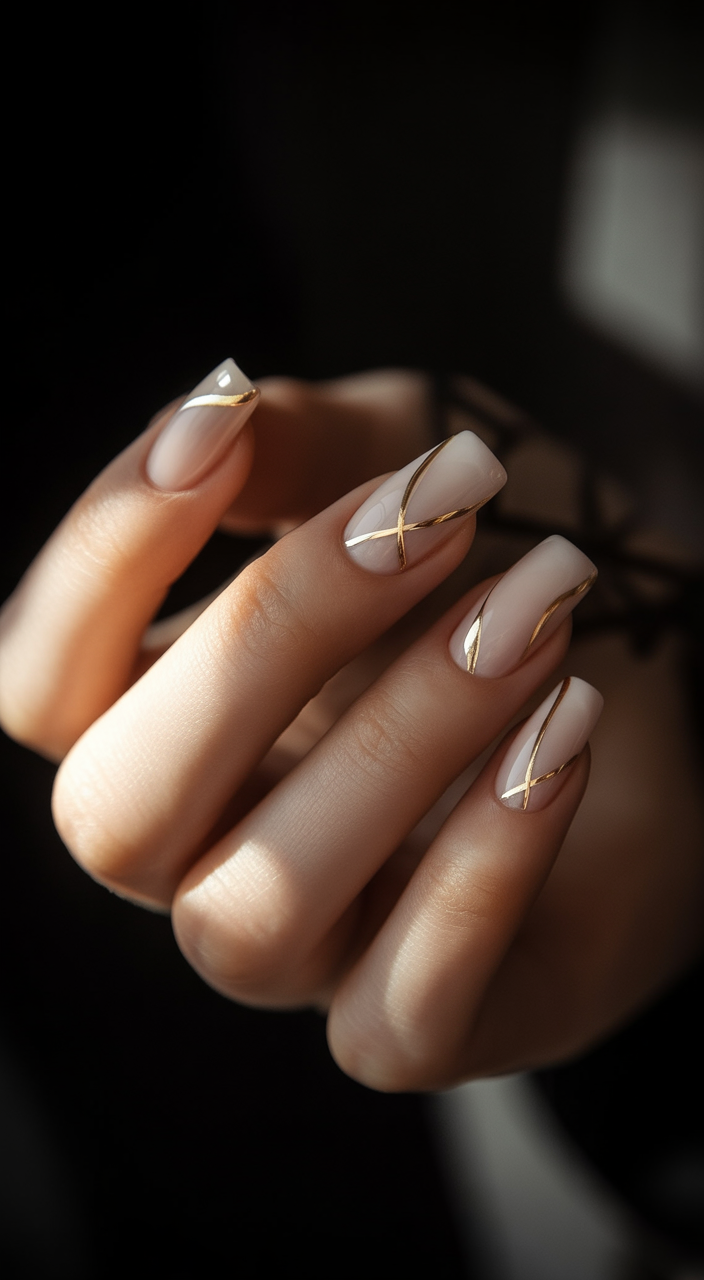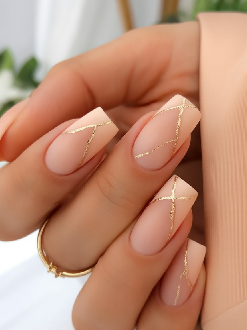 They are not overstated yet not at all boring, these matte nude nails adorned by thin gold touches are art of the present. The lines are concrete and geometrical, so they give a feeling of order and character but it cannot be considered extravagant or low-key. It’s calm sophistication with a creative edge.