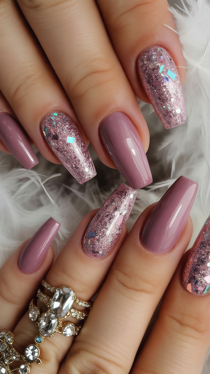 24. Mauve Acrylic Coffin with Bold Glitter Mix