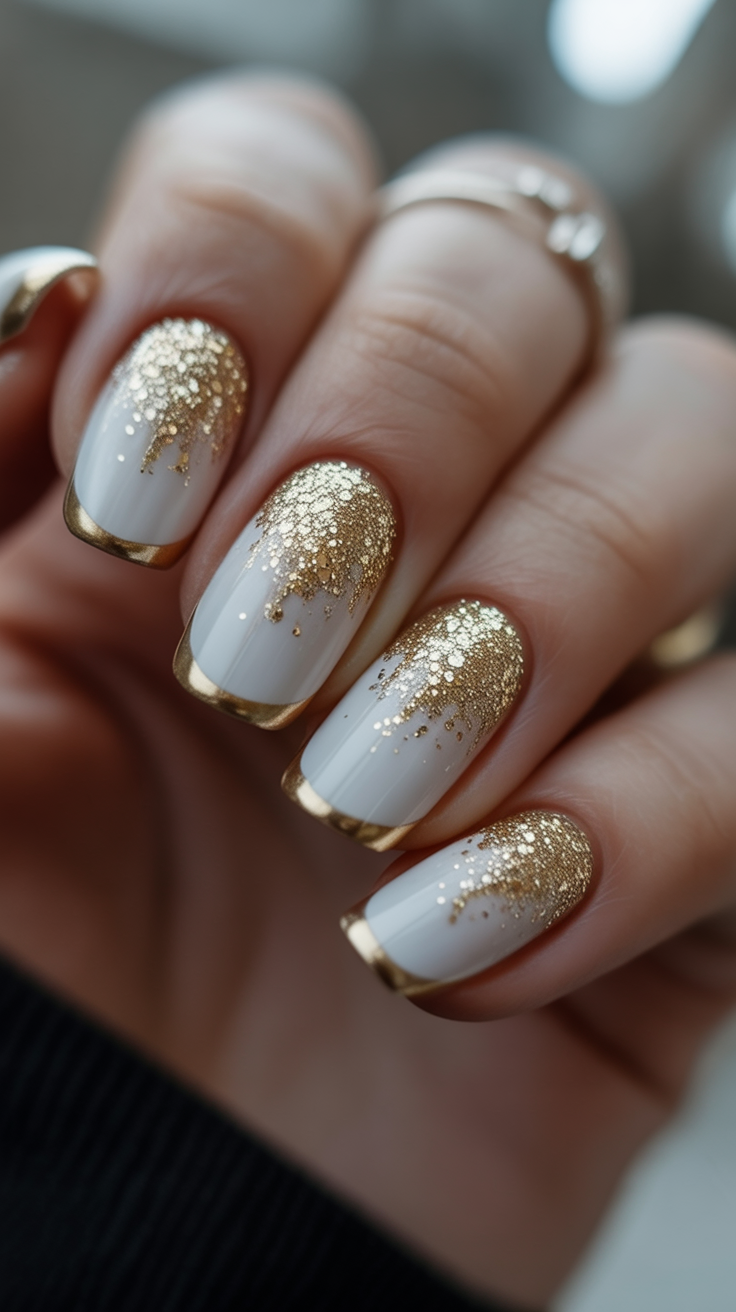 Reminiscent of golden rain on a snowy night, this manicure is a party, in itself. The chic gold glitter blends perfectly into the crisp white polish to give the effect of feeling luxurious without being too much. It is daring but still beautiful and elegant- a winter showstopper.
