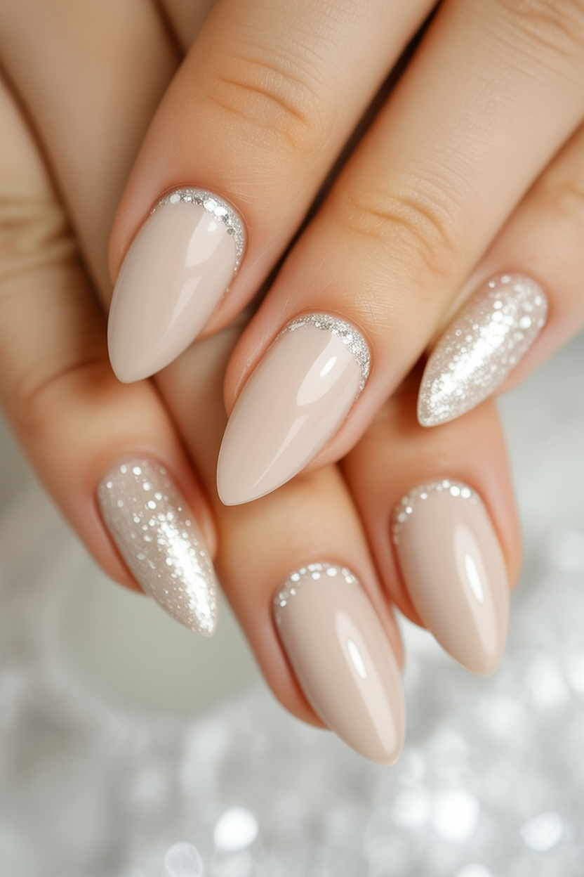 The nails have the impression of a party atop a champaign flute. The opalescence and silver sparkle of the crescent glitter cuticles gives a perfect sparkly accents and upscale effect with neutral accent base. The oval shape and almond cut is sophisticated and refined and not bawdy.