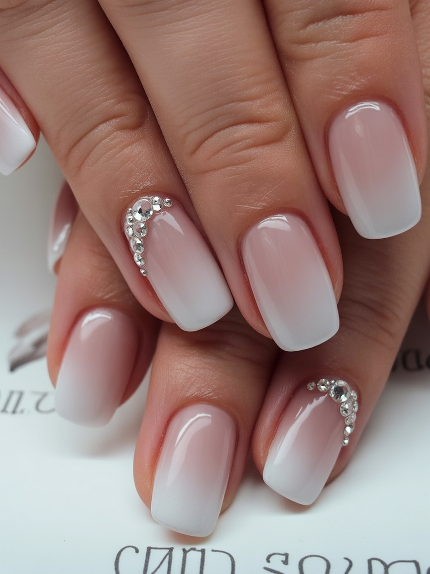 This is ideal on short- to medium- length nails, with a square or soft-square end. The clean gradient of blush-to-white works on all skin tones and the rhinestones complement the over all look by bringing it to the red carpets. Wear some silver jewelry with it to create the look of a clean and modern elegant summer style.