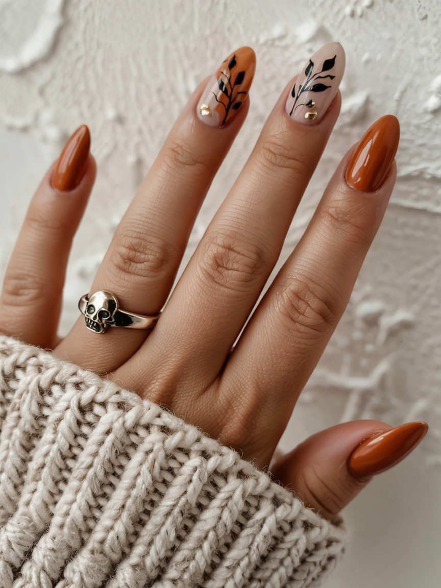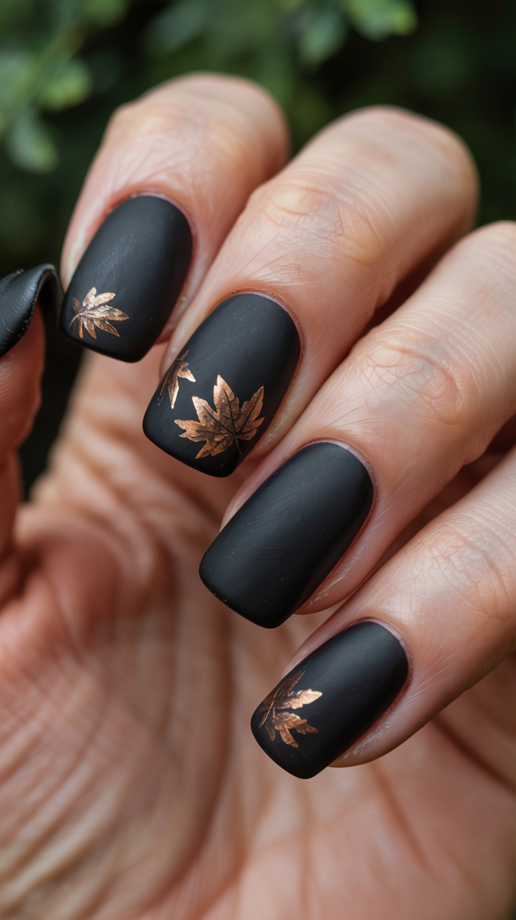 15. Matte Black Nails with Copper Maple Detail