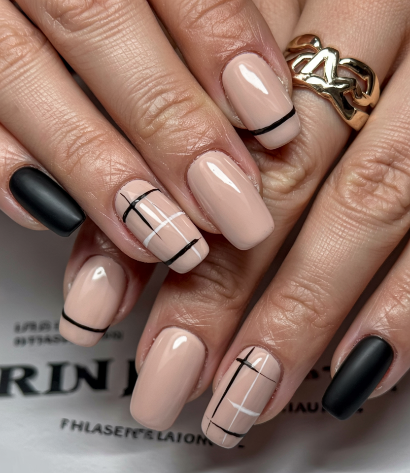 2. Matte & Glossy Neutrals with Modern Plaid
