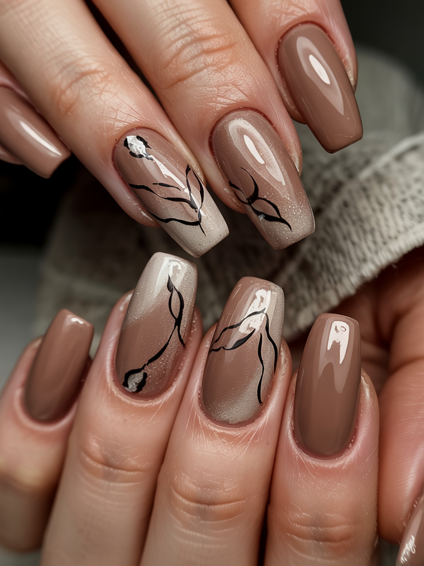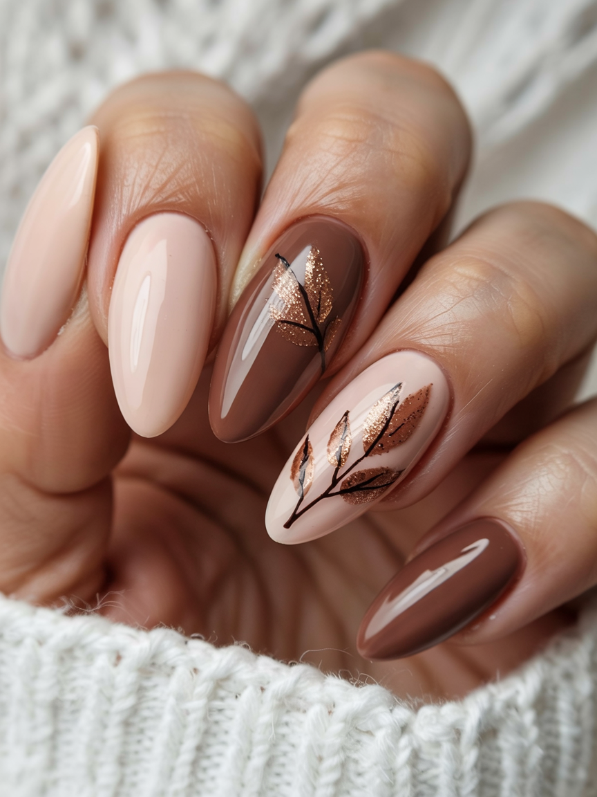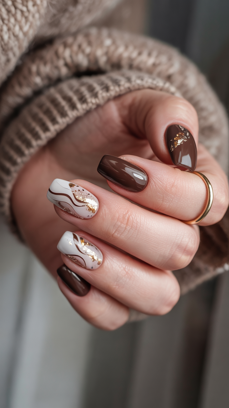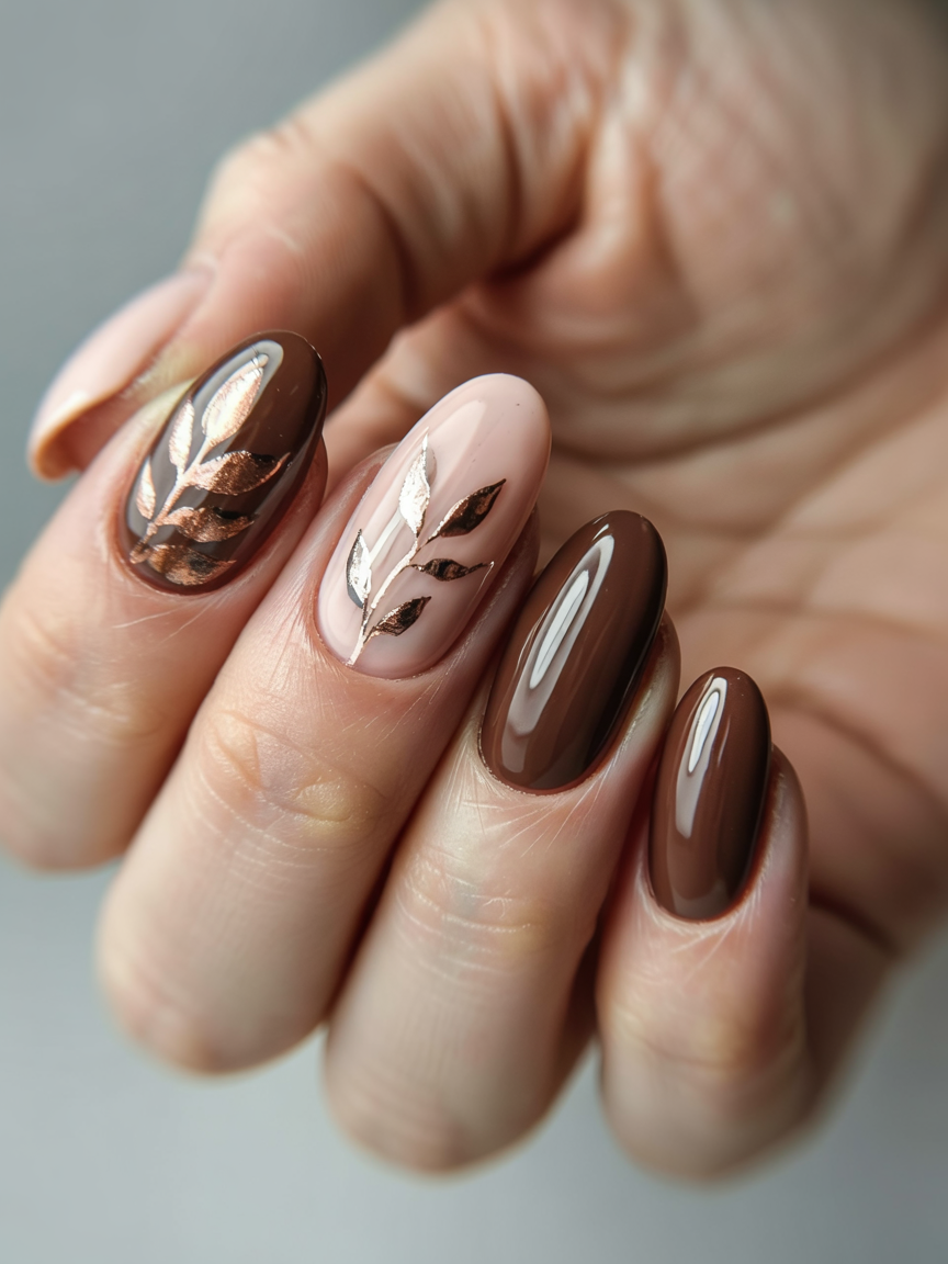 25. Elegant Mocha Nails with Golden Leaf Accent