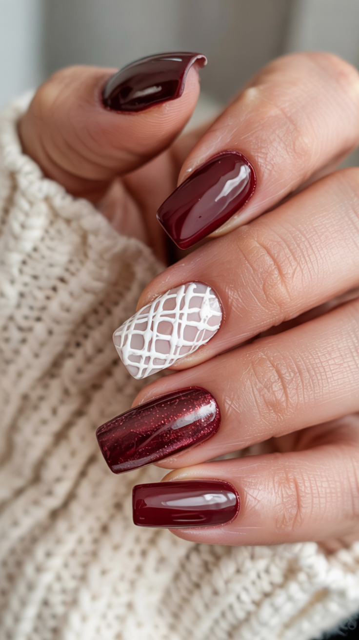 This bold burgundy set serves serious sweater weather vibes. Possessing a combination of glossy wine colors and a single white textured nail, it is quite fresh, rich, and playfully cozy in a sense at the same time. It made me feel quietly confident under the point of view of I am prepared to take on fall; it may even include the first crack at cabernet.