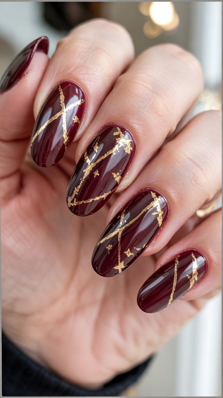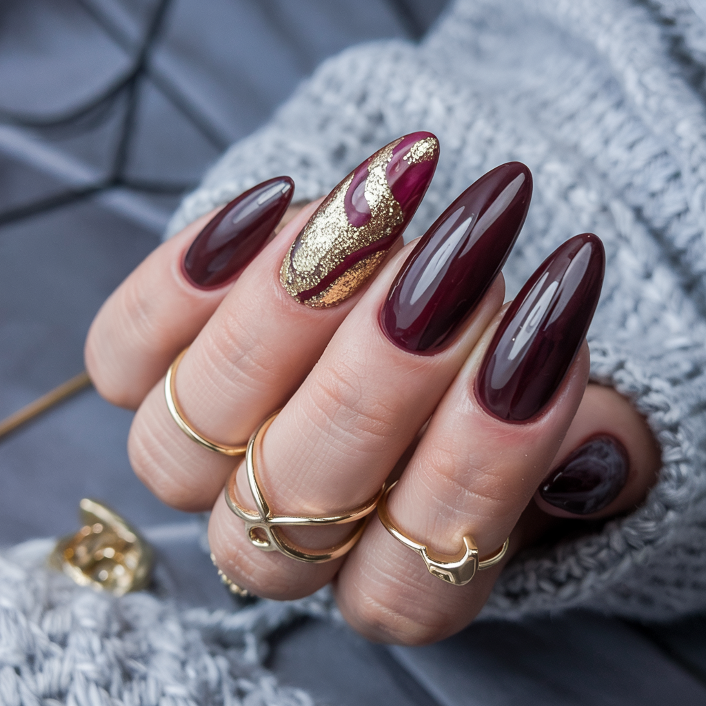 This one is simple but stunning deep merlot manicure decorated with one gold foil accent nail. It’s rich, regal, and slightly mysterious — like that one perfect burgundy coat you reach for every October. It’s simple, but it carries major presence.