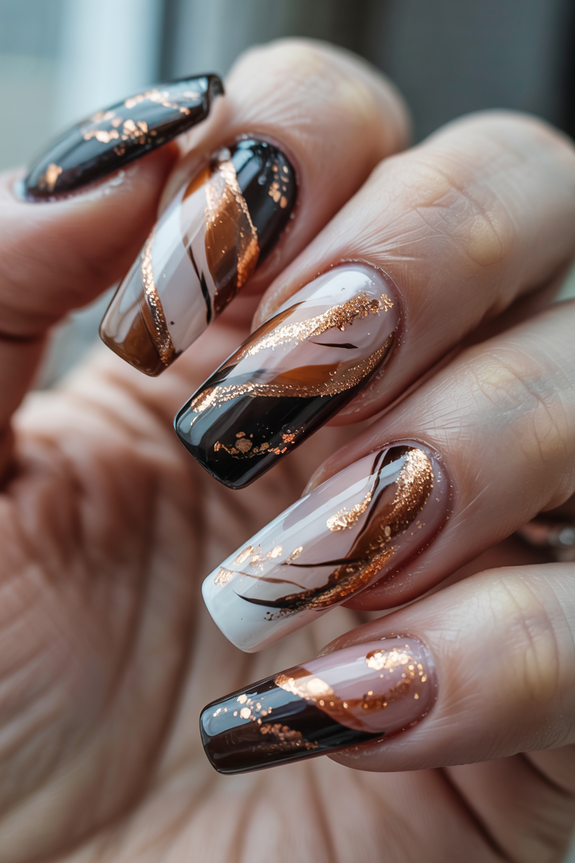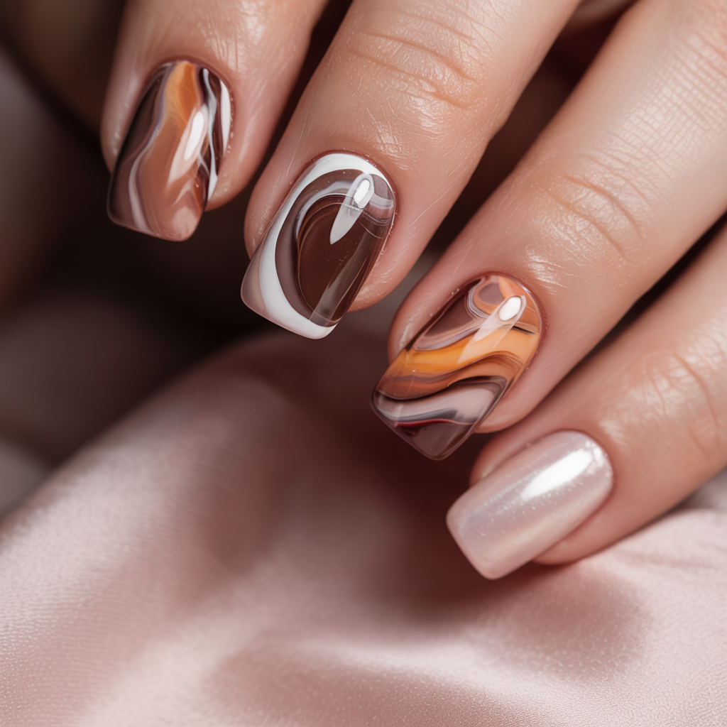 6. Swirled Mocha & Caramel Fall Marble Nails