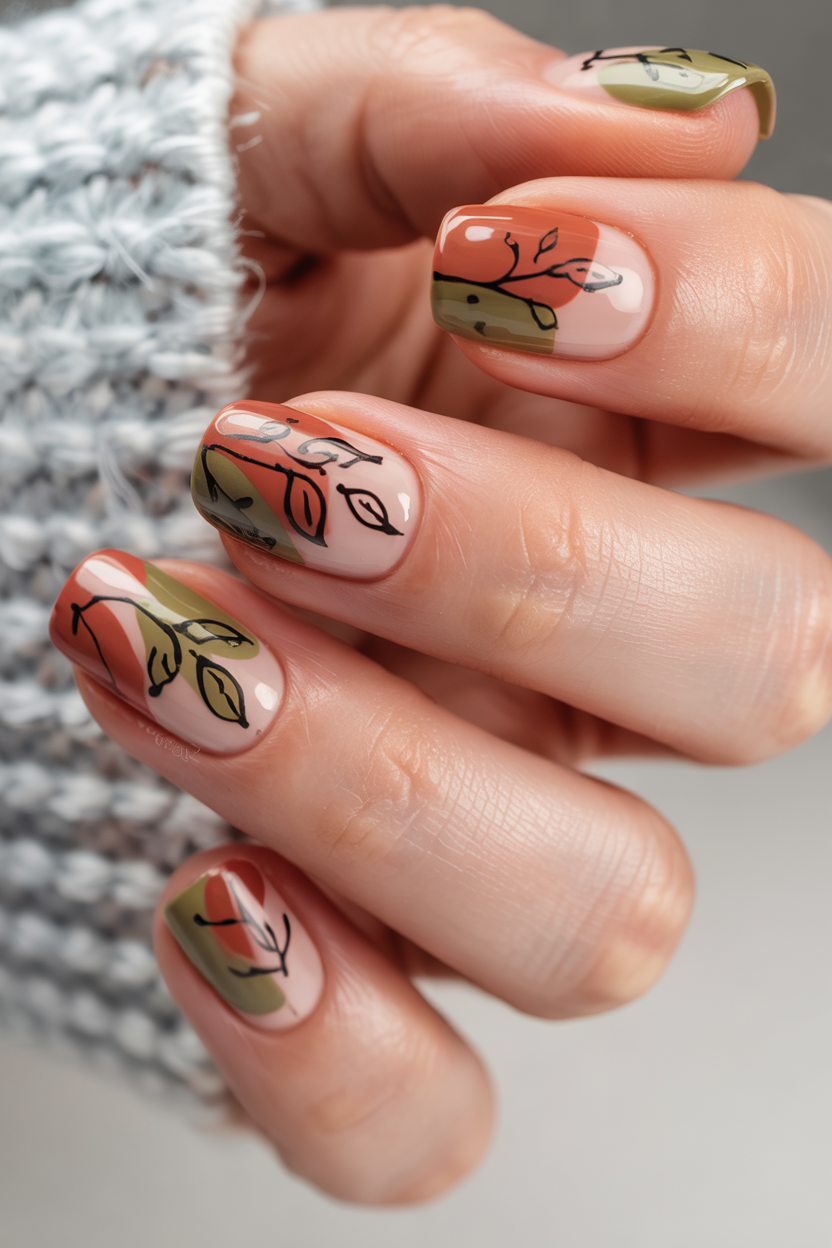 22. Artistic Leaf Nails with Modern Color Blocking