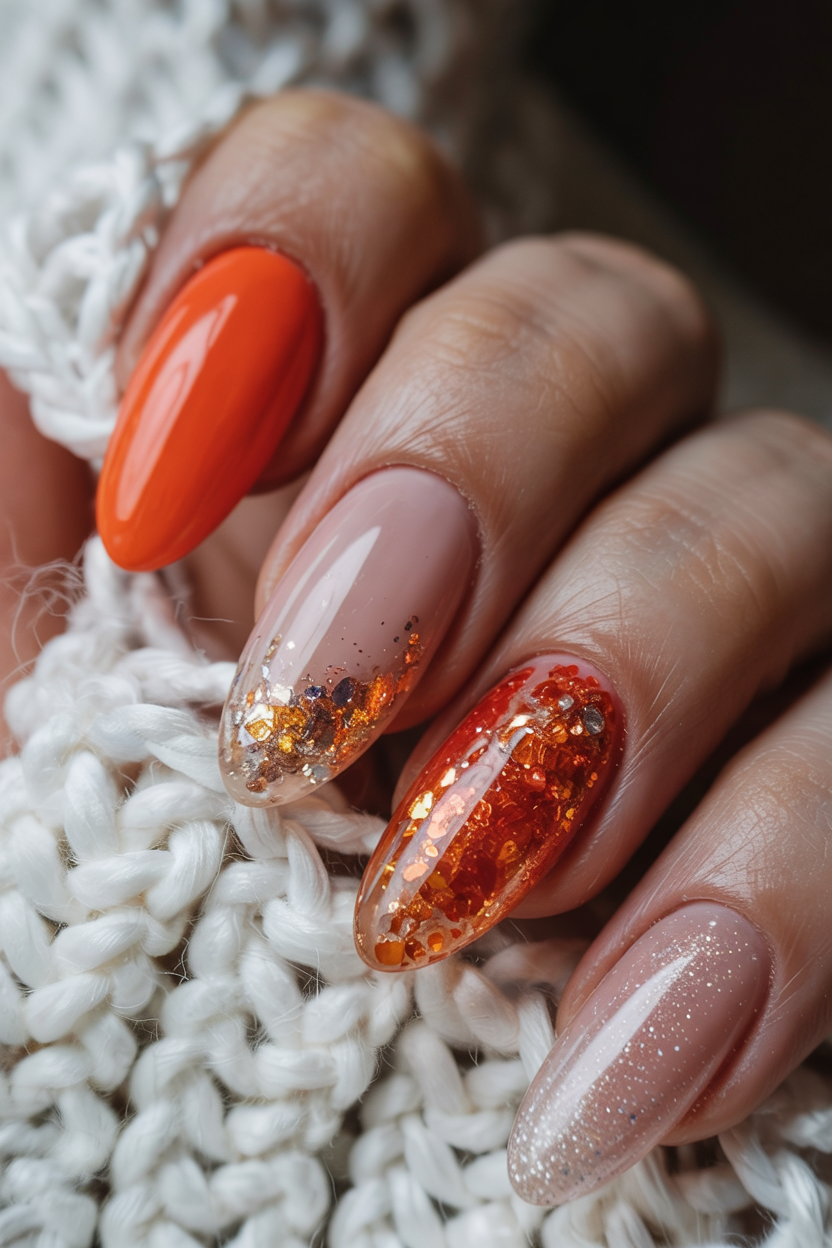 Bright orange, hot nudes, and jangling glitter make it the best pumpkin spice influenced manicure. Every nail is a mini-party – it is what harvest festivals, apple picking, or autumn weekend in on a chilly fall day with a fall-scented candle require.