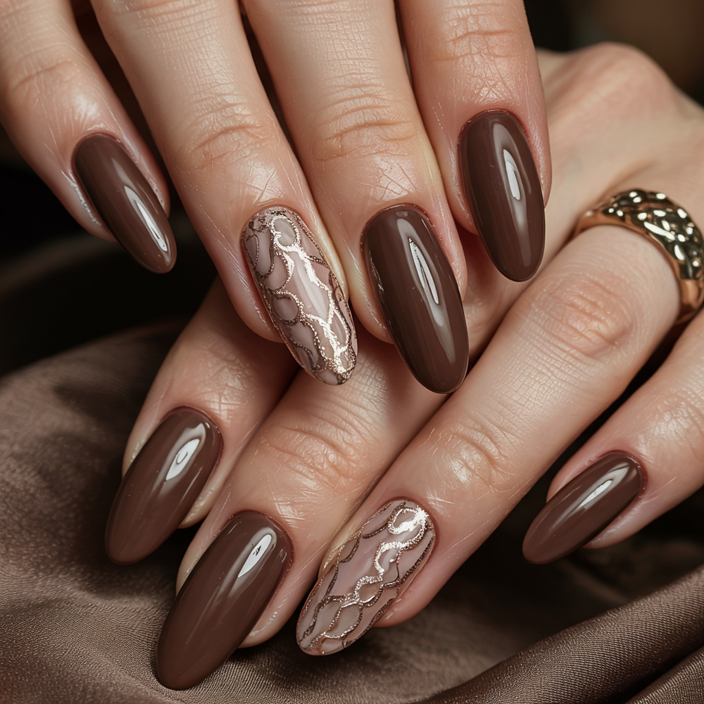 These mocha nails are pure richness. The deep brown, the glossy deep brown is contrasted with two accent nails, which are covered in a soft shimmer and metallic netting, a glam material, but in a delicate contrast.
