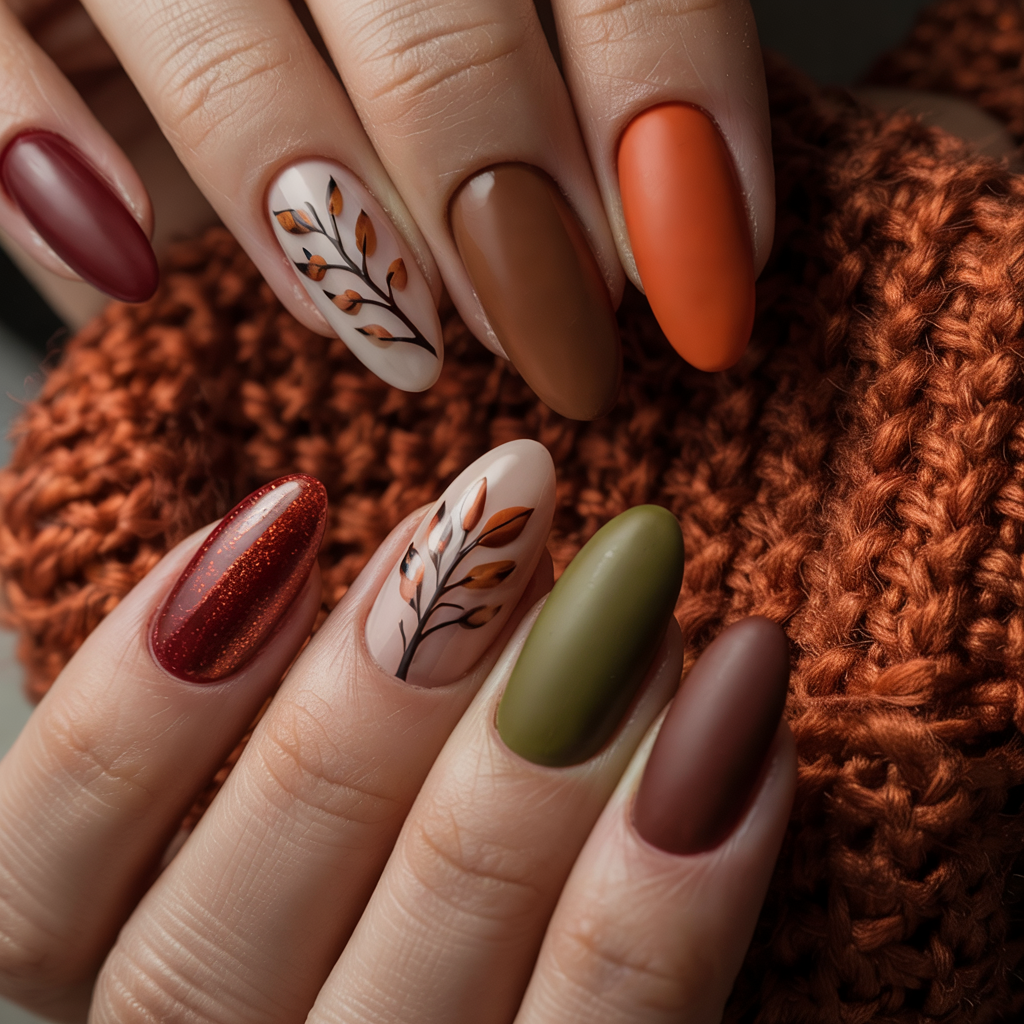 8. Multicolor Matte Autumn Leaf Nails