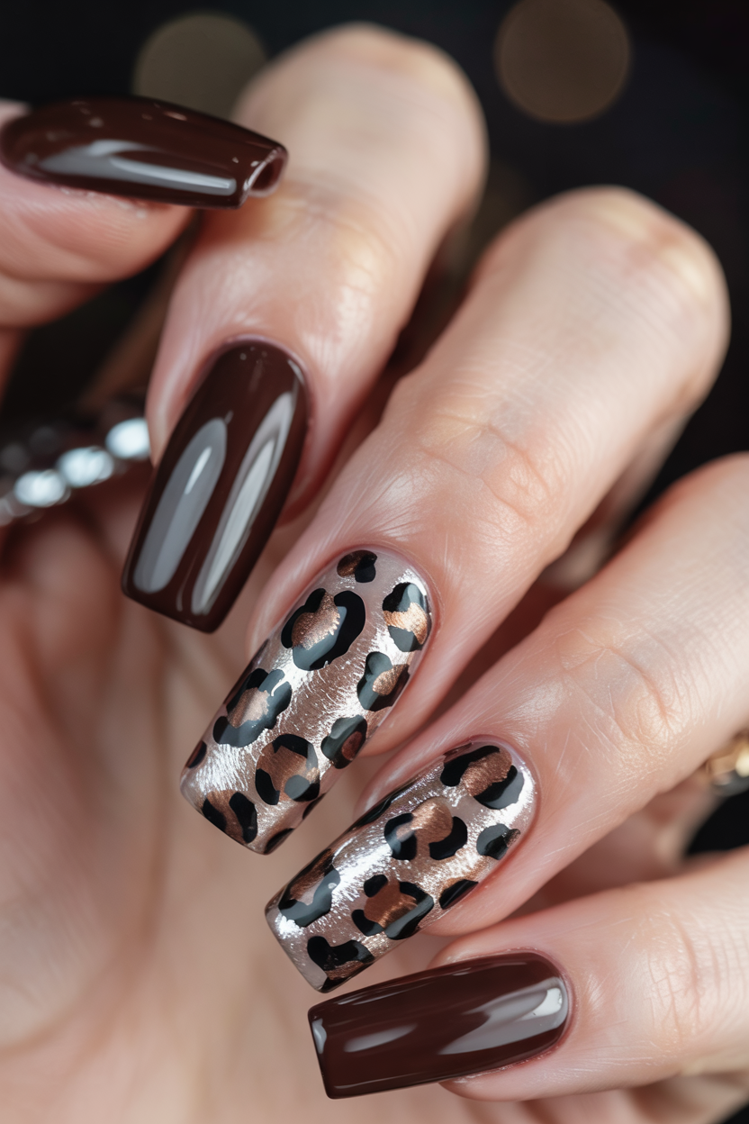9. Glossy Brown Coffin Nails with Leopard Accent