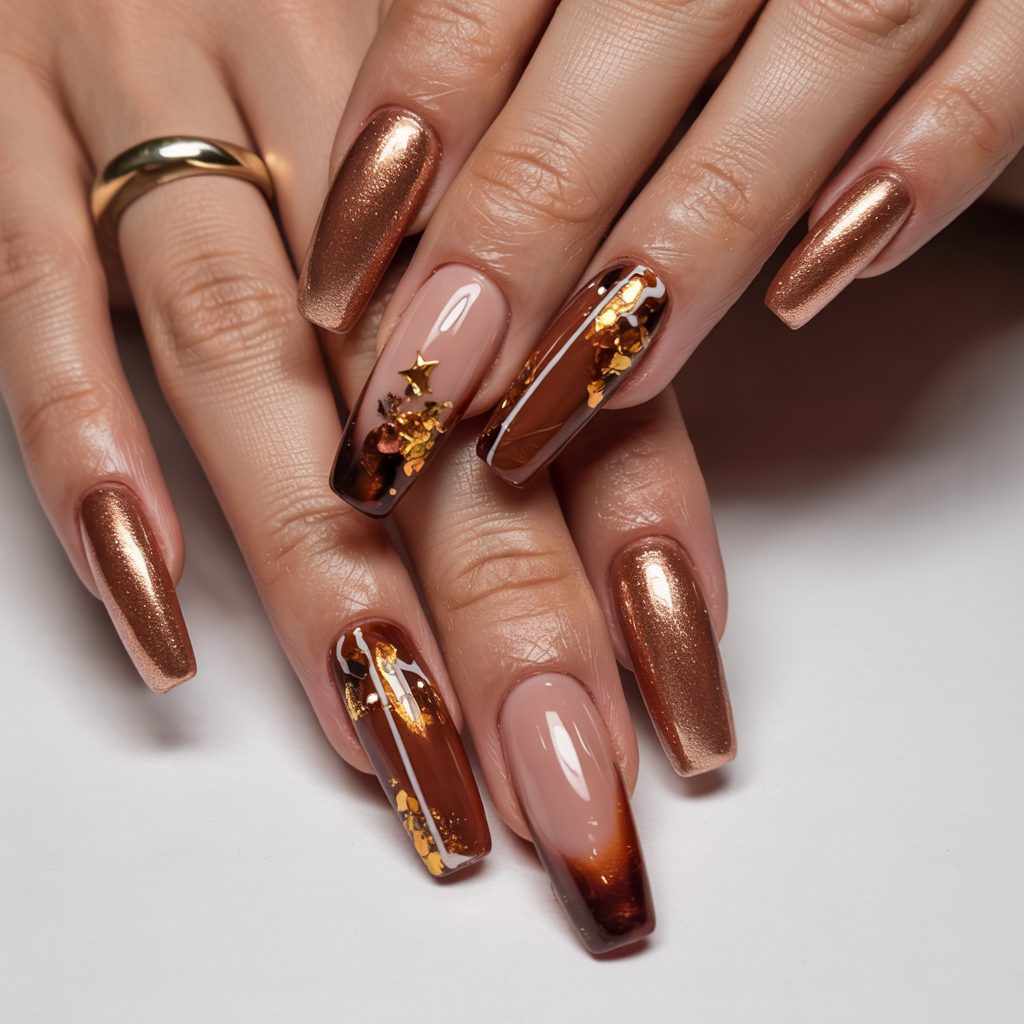That autumn-appalaunching color and that warm chocolatey tones marry harmonious artistry in this design. A soft rose gold foil that drifts across a nude base makes the entire effect feel radiant and yet sensible, exactly as falling leaves greet the sun on an Autumn morning stroll.