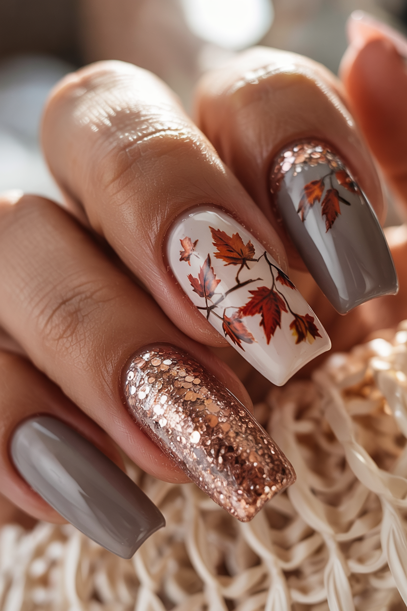 21. Rose Gold Glitter and Maple Leaf Nails
