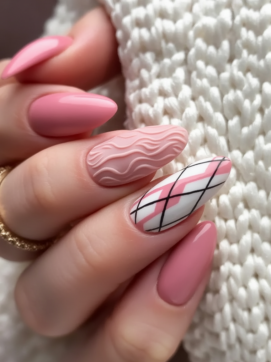 These nails are a heart hug in form of pink polish. The ribbed knit fabric or the soft argyle design sends out the aura of appeal and comfort everywhere. It is not fussy but feminine with the soft tones, and the playful design has the promise of the fall layers though in the most pretty manner.