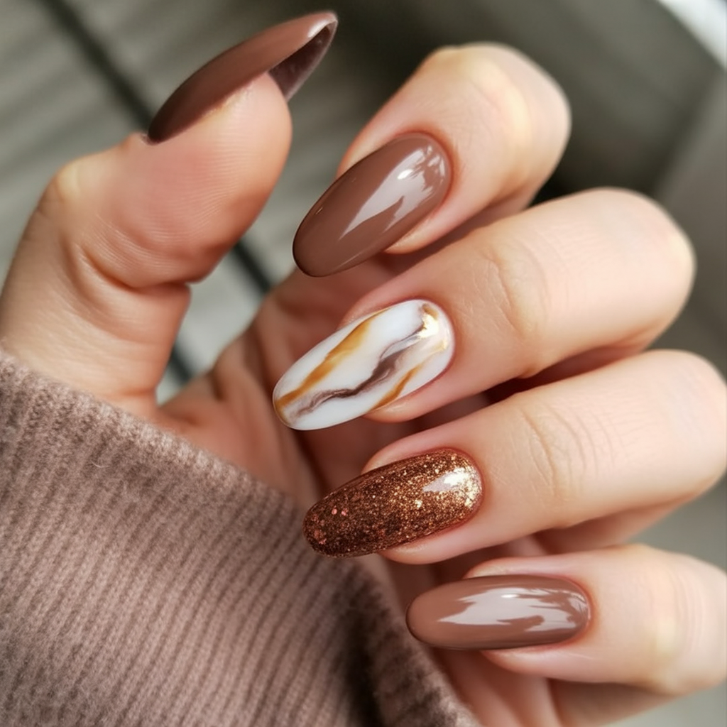 These nails are similar to drinking a fancy caramel latte at your favorite cafe. The shimmering brown tones with swirled marble accent and shimmering glitter of copper is a warm, luxurious palette that is as indulgent, as it is welcoming.