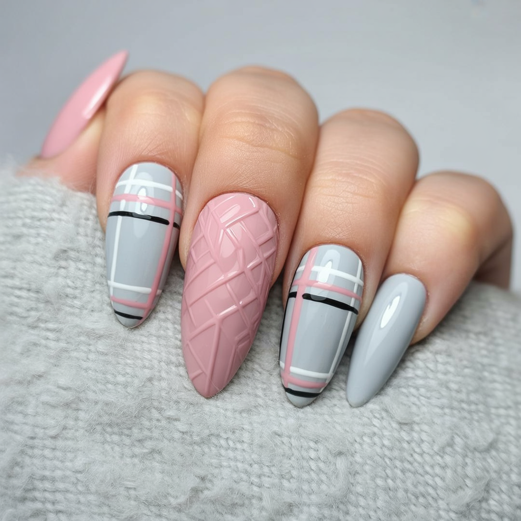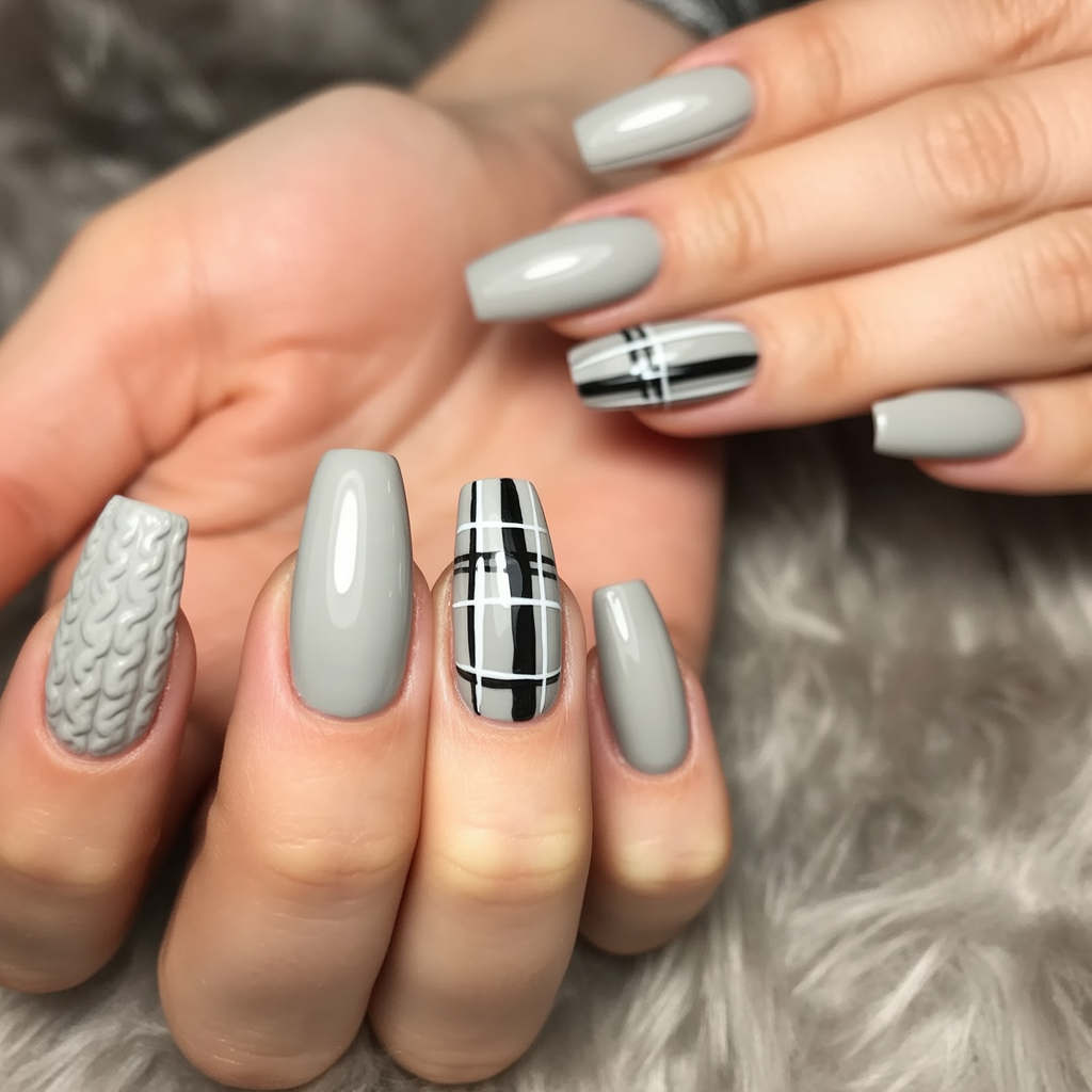 It is sleek and cuddly at once, in this cool-toned gray mani, featuring both plaid and sweater finish. The daring style of black and white stripes provides it with a city-like chic and the subtle knit structure introduces a layer of home-like comfort.