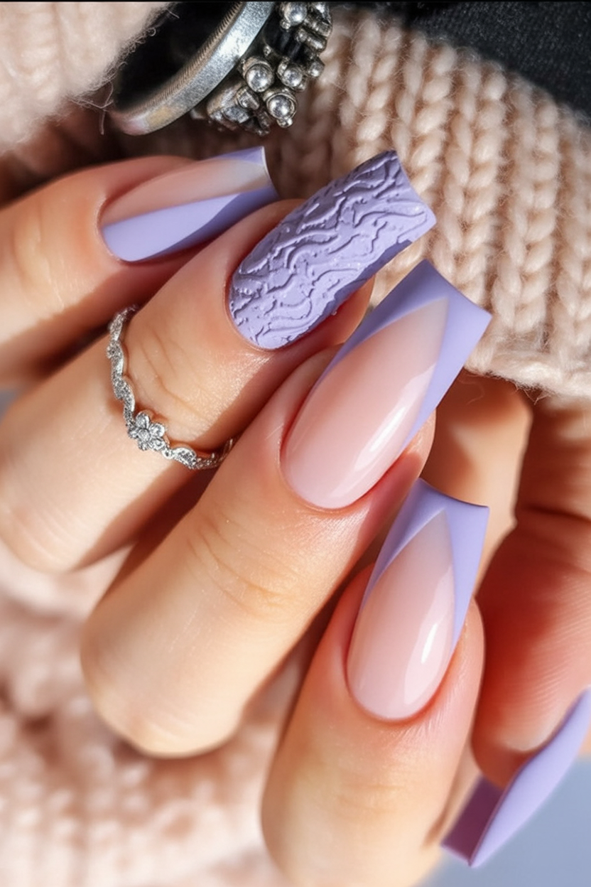 Lavender in fall? Yes, please. This surprise pastel version of a sweater nail is a dreamier softness into cooler weather dressing. The combination of a French tip that is bold, the base that is subtle, and just one finger that is knit-textured it is quite playful, yet not too precious.