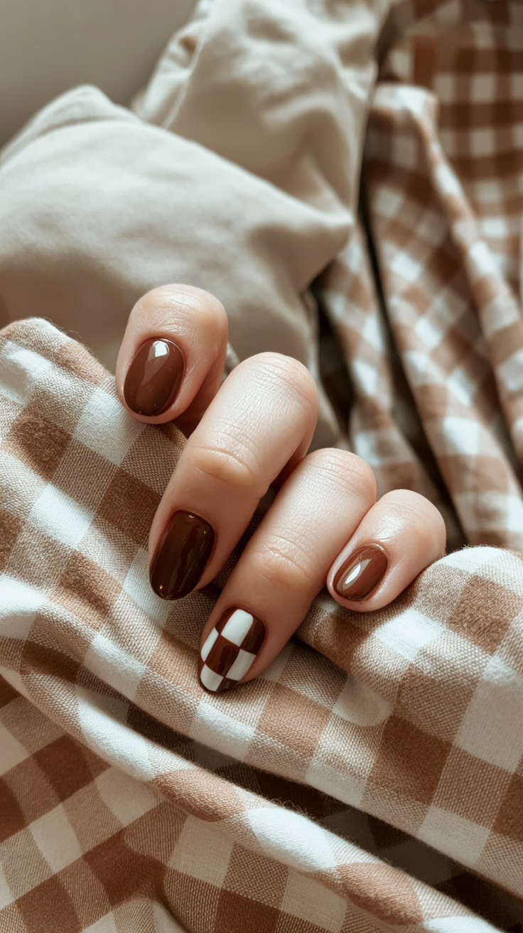 This is like a spiced pumpkin pie and hot cocoa in nail combo feel since it is a creamy checkered match. The high gloss brown polished surface is punctuated by the very graphic checker pattern, which stands out boldly in white. Think of it as cozy with a wink.