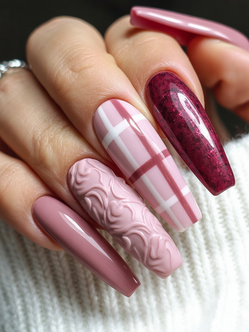 This beautiful ensemble is the result of comfy and glamorous coming together. These textured knit nails add a punch of pink to a glossy plaid and a burgundy shimmery accent nails and create the most play with fall rich color scheme in a girly way.