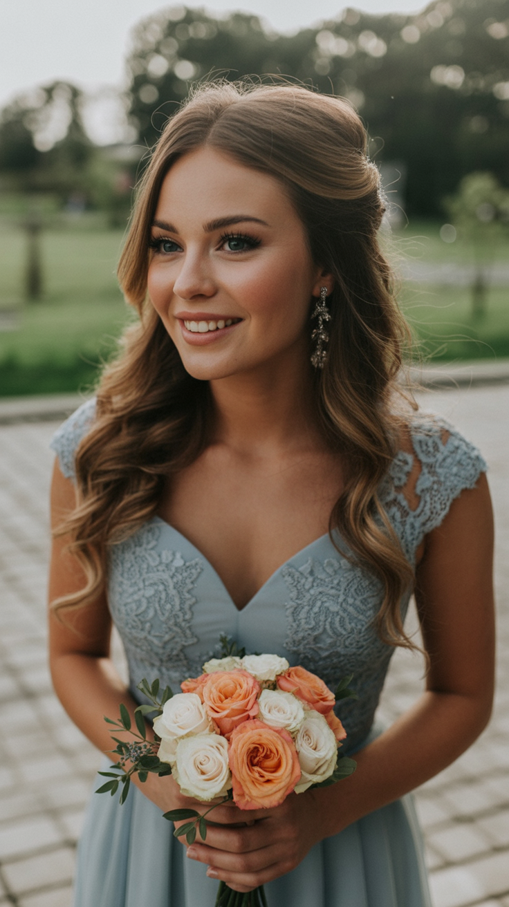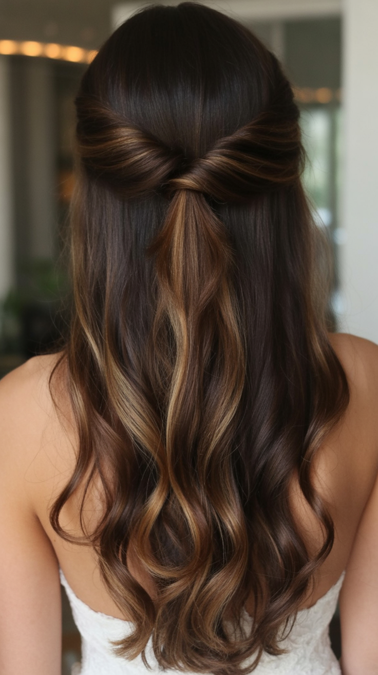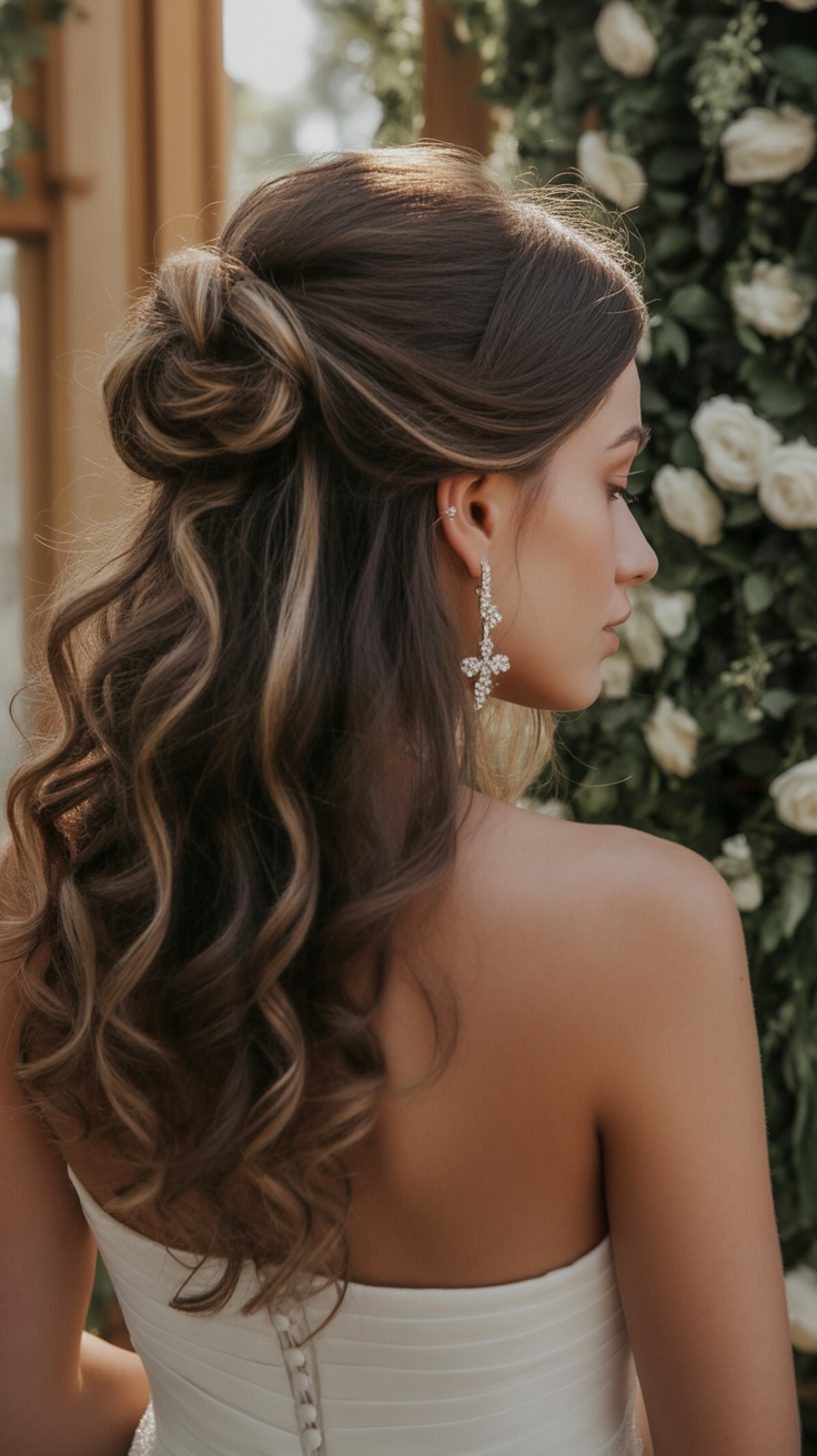 Everything about this hairstyle whispers “bridal perfection.” It has wavy but soft half-up bun and full, shiny curls that are designed to look good on the aisle itself or any time you want to feel utterly memorable.