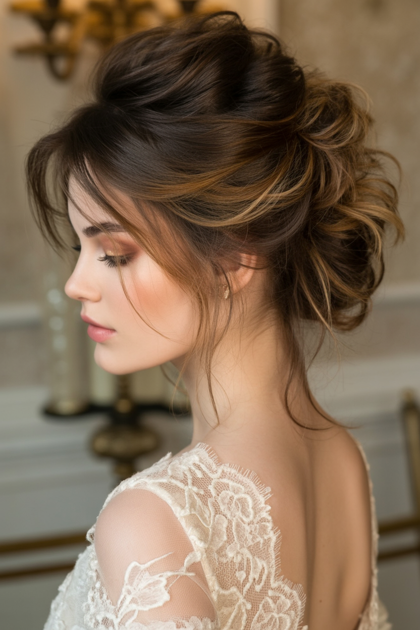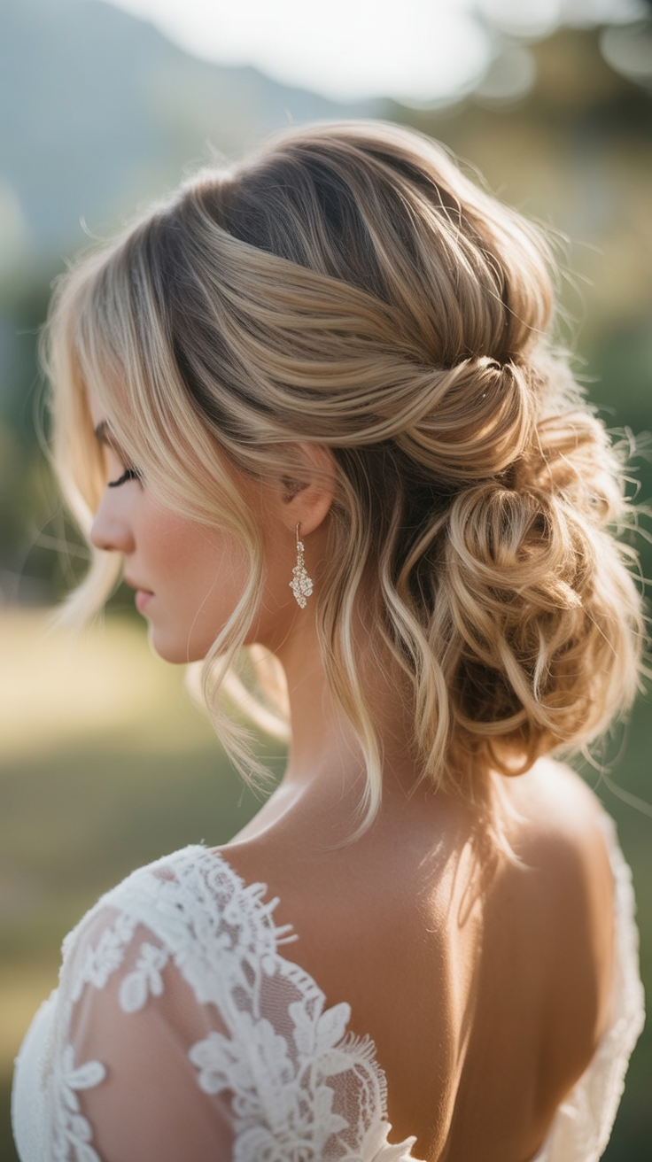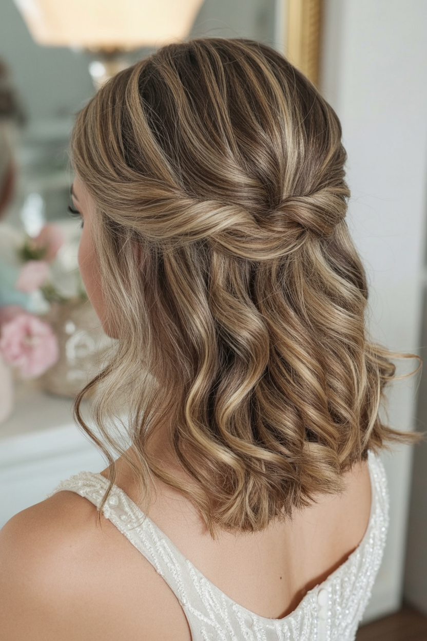 It’s perfect for bob-length cuts or just-past-the-shoulder hair. This is a favorite of bridesmaid short hair ideas; it is very flattering on petite bodies with small face shapes. Apply a curling iron in 1-inch sections and texturizing spray to add piece-y definition. Bonus: it photographs beautifully from every angle.