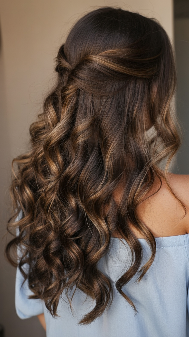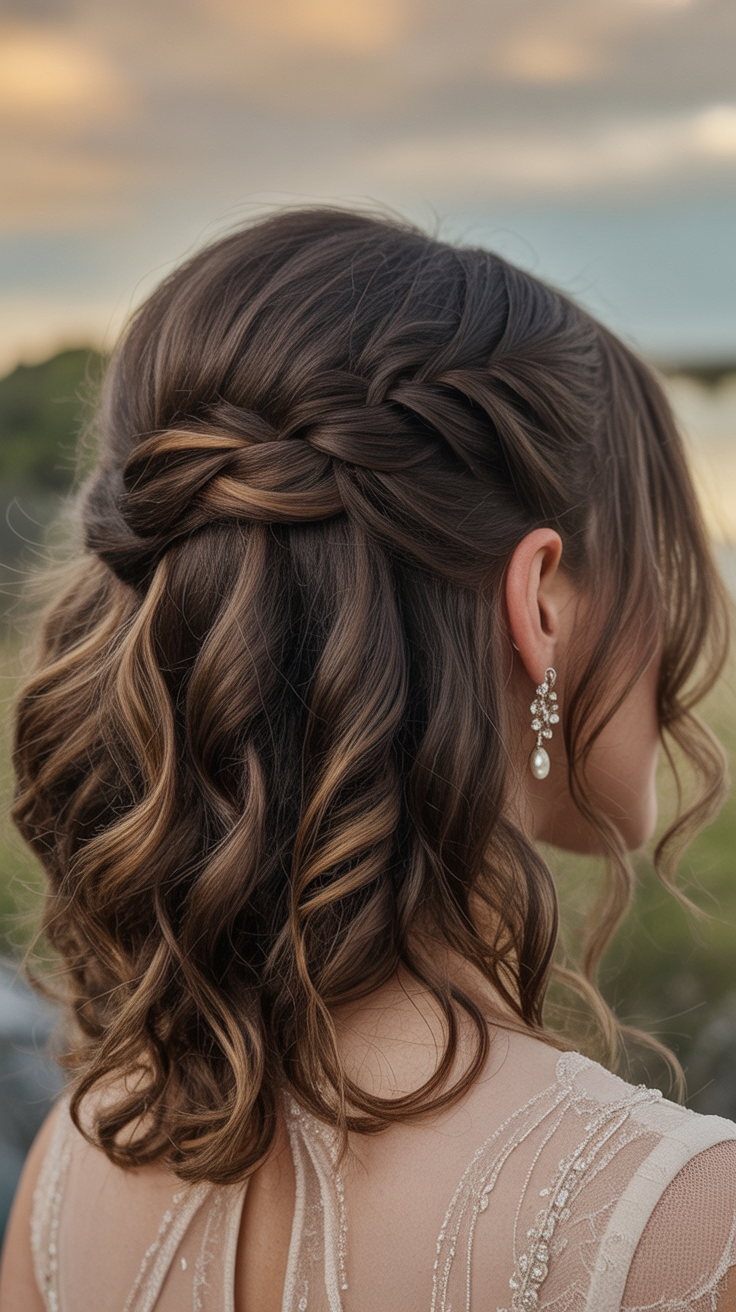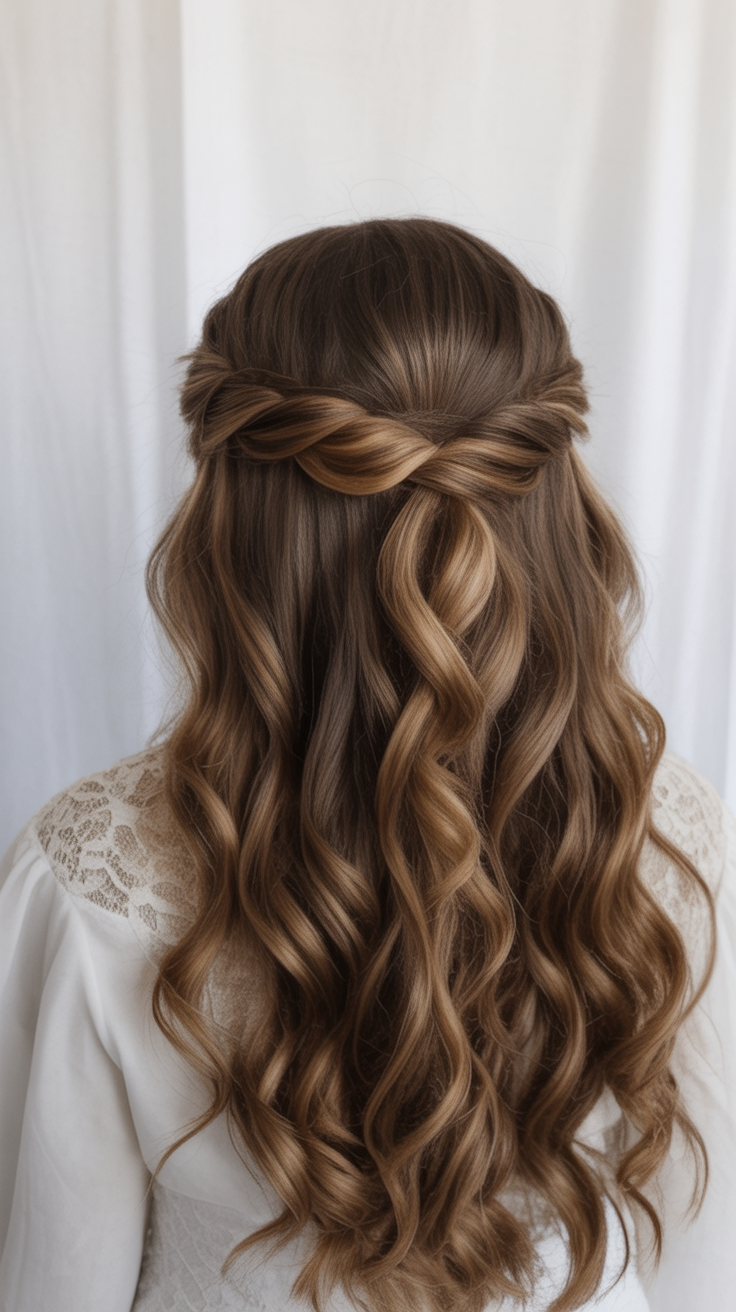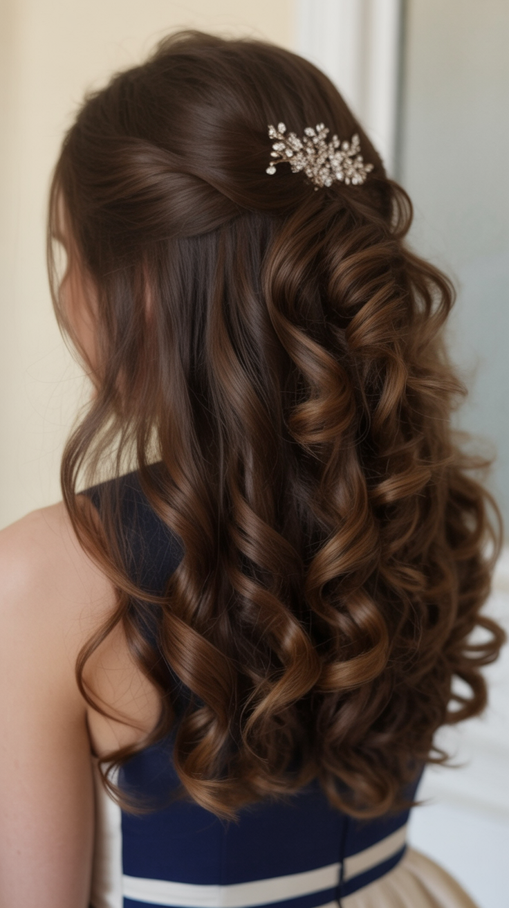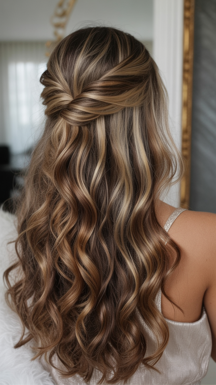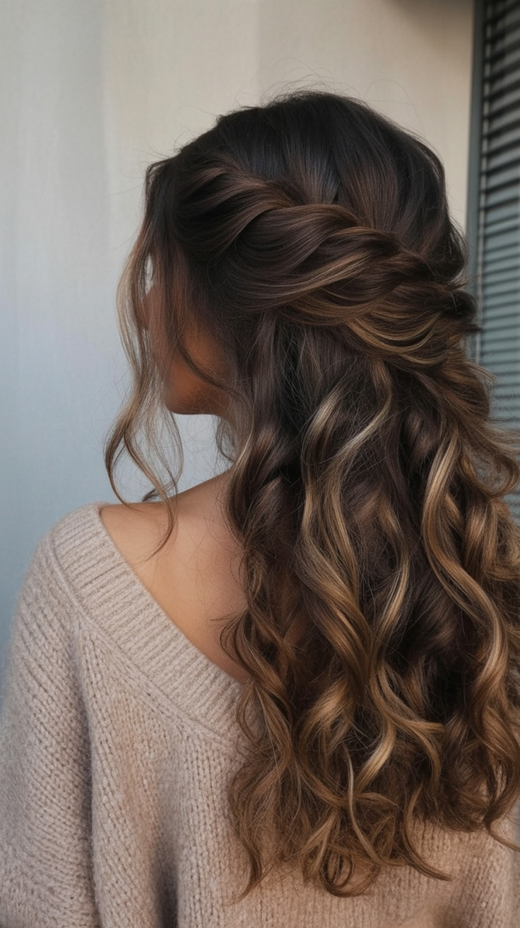 This style is the epitome of effortless elegance. With soft, voluminous curls flowing down and a delicate twist pulling the sides back, it’s the kind of hair that looks good from every angle — romantic, relaxed, and very wearable.