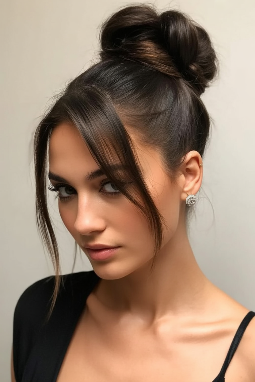 Sleek, trendy and a bit naughty – this sleek high bun with curtain bangs speaks with a strong tone of “I am busy, so get out of my way”. It is never boring though, as there is that dash of soft face-framing stuff, which instantly makes it sophisticated.