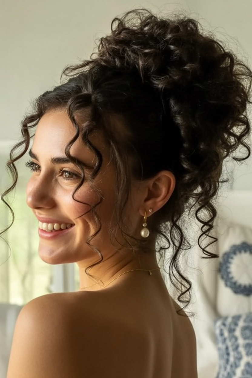 There is loads of life and personality in this perky high curly updo the look that glows with energy. And then there is the carefree glamorous quality to it, with tons of curls and a few tendrils around the face, which is bright and happy and a bit flirtatious. It is ideal to flaunt your great cheekbones or a nice necklace.