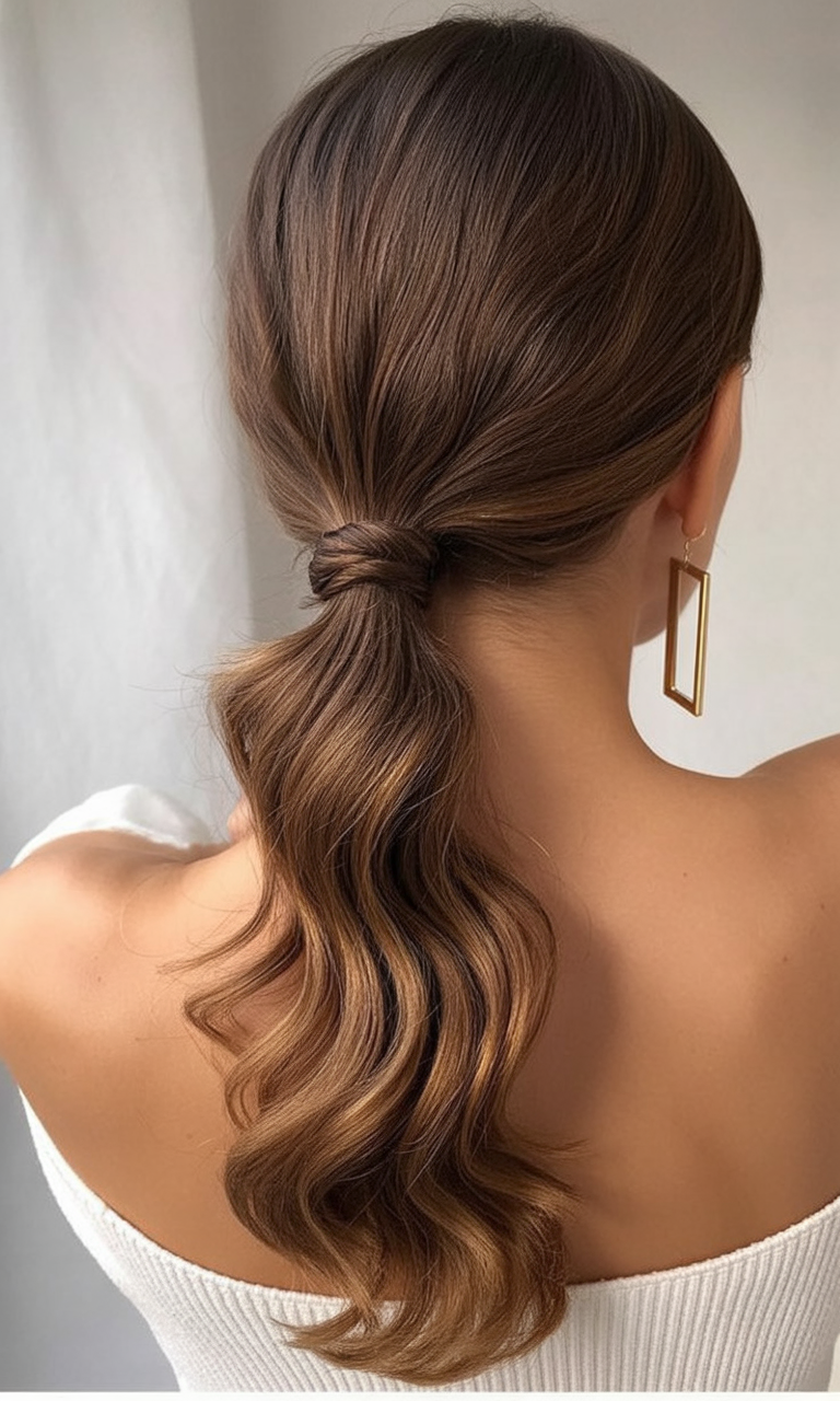 Smooth, low-key, and cool as a cucumber-that smooth ponytail bound up with a lock of your own hair is the style that simply says, ‘I am putting it together.” It is ideal on days where you need your hair off your face yet want to feel a little lifted and purposeful. And paired with bold earrings? A total power move.